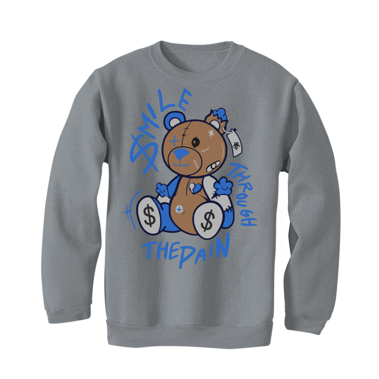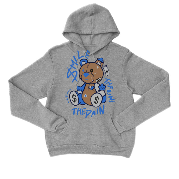 This product comes in a hoodie, t-shirt, and sweatshirt that features the phrase "SMILE THROUGH THE PAIN" with a stitched bear.