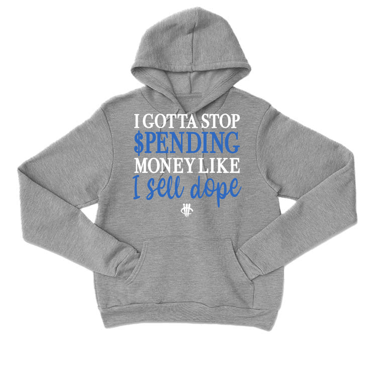 This product comes in a hoodie, t-shirt, and sweatshirt that features the phrase "SPENDING I SELL DOPE" in decorative fonts printed on fabric.
