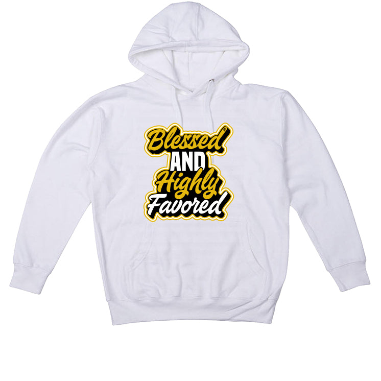 This product comes in a hoodie, t-shirt, and sweatshirt that features the statement  "BLESSED AND HIGHLY FAVORED" in decorative fonts.