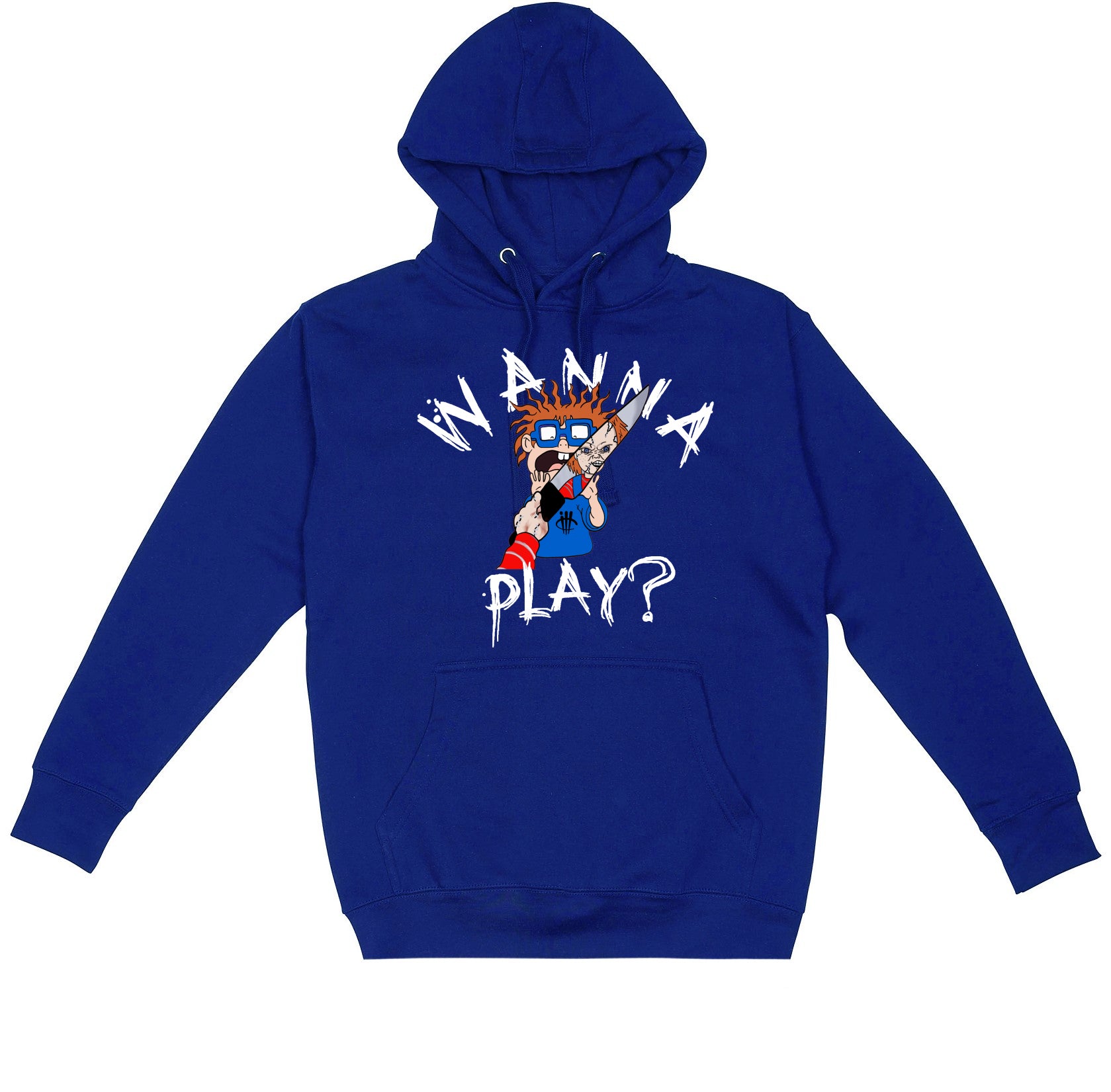 Our sweatshirts, t-shirts, and hoodies say "WANNA PLAY?" with screaming Rugrats Chuckie and Child's Play Chucky's hand holding a knife.