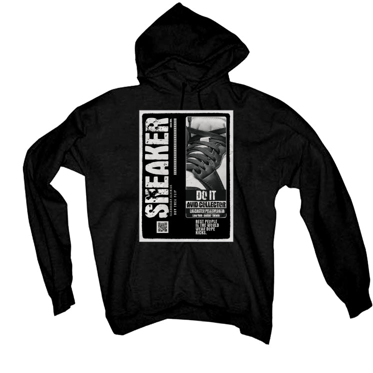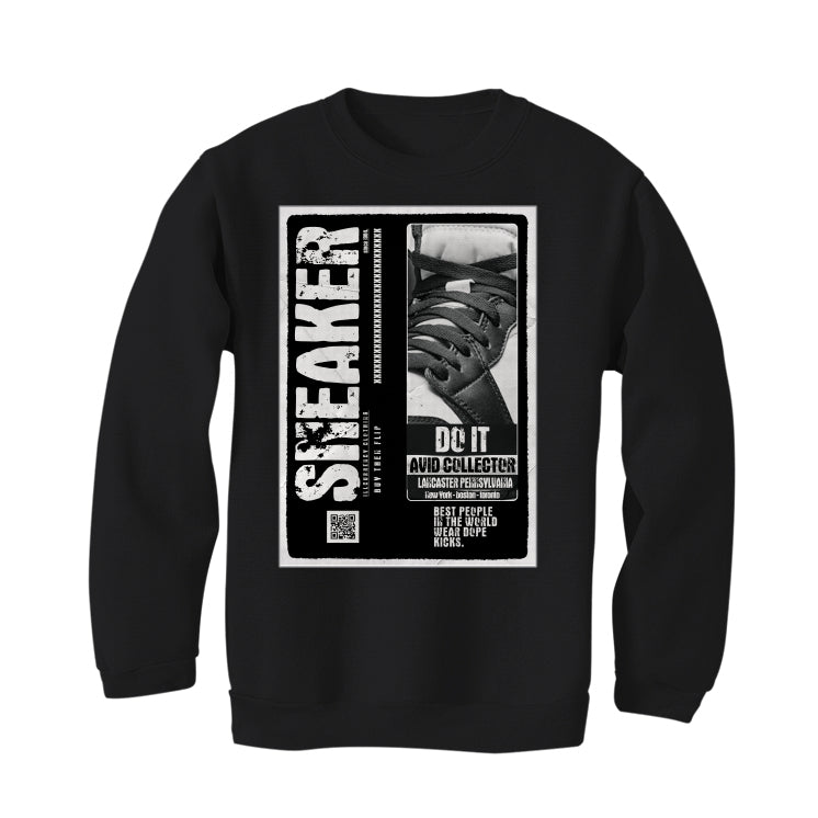 Our collection includes hoodies, t-shirts, and sweatshirts showcasing the phrase "SNEAKER / since 1984. / ILLCURRENCY CLOTHING / BUY THEN FLIP / DO IT / AVID COLLECTOR / LANCASTER PENNSYLVANIA / New York - Boston - Toronto / BEST PEOPLE IN THE WORLD WEAR DOPE KICKS," along with an image of the Air Jordan 1 High "85 Black White” shoes, alongside a QR code and various graphic elements inside a larger rectangle.