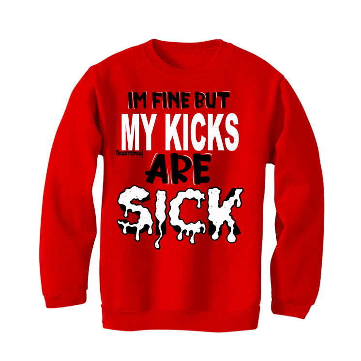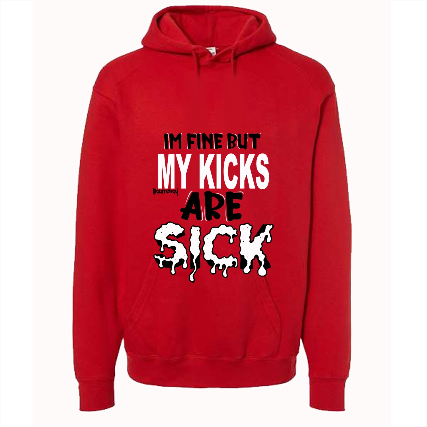 Our sweatshirts, tees, and hoodies come with the words "IM FINE BUT MY KICKS ARE SICK" on them.