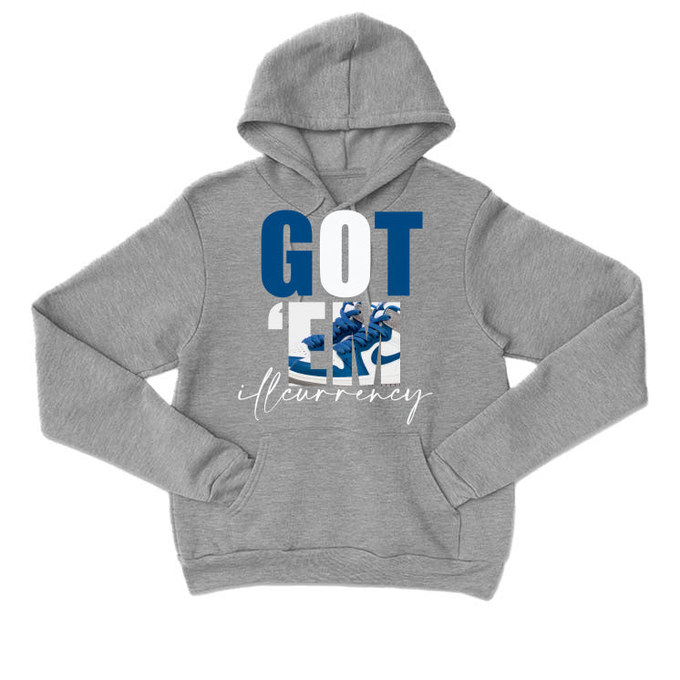 These tees, sweatshirts, and hoodies are printed with an image of the Air Jordan 1 High OG "True Blue" and the words "got 'em."