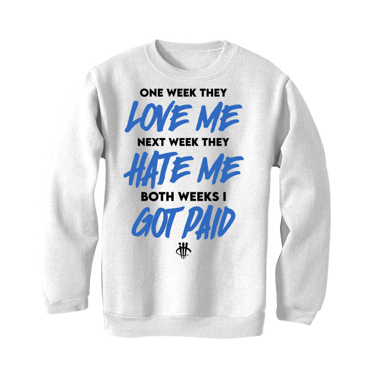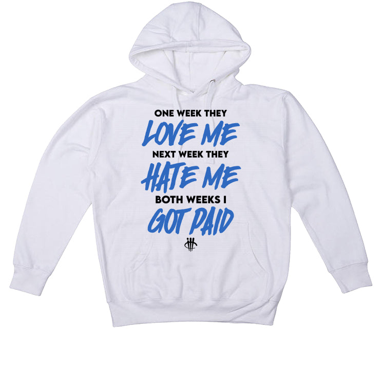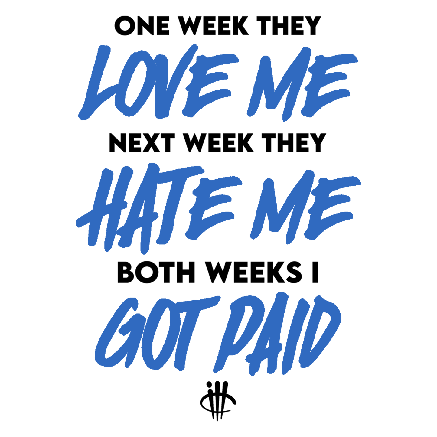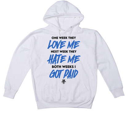 These hoodies, t-shirts, and sweatshirts have the words "ONE WEEK THEY / LOVE ME / NEXT WEEK THEY / HATE ME / BOTH WEEKS / I GOT / PAID" with small illCurrency logo on them and will make the perfect complement to your shoe collection.