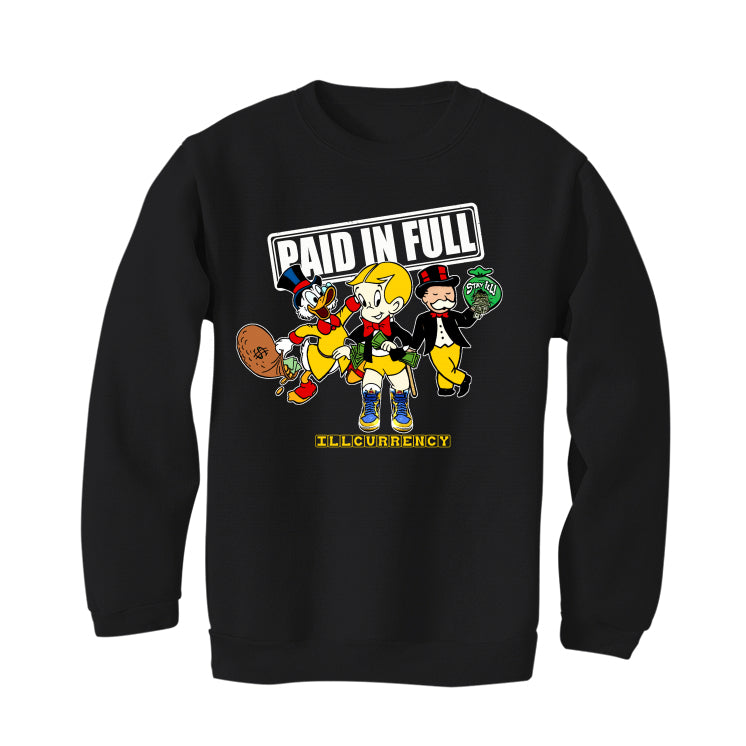 "PAID IN FULL / ILLCURRENCY" with the first phrase inside a rectangle, the brand name inside squares, and illustrations of Scrooge McDuck holding a bag of money, Richie Rich holding cash and wearing Air Jordan 1 Retro High OG "Laney" shoes, and the Monopoly Man holding a bag of money.
