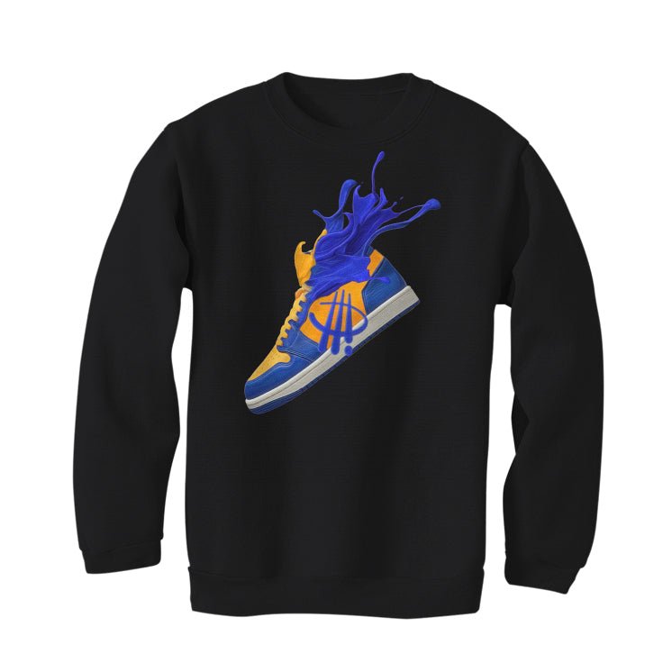 This collection includes options like hoodies, t-shirts, and sweatshirts that showcase a trendy image of the sneaker accented with dynamic blue liquid splashes printed on the fabric.