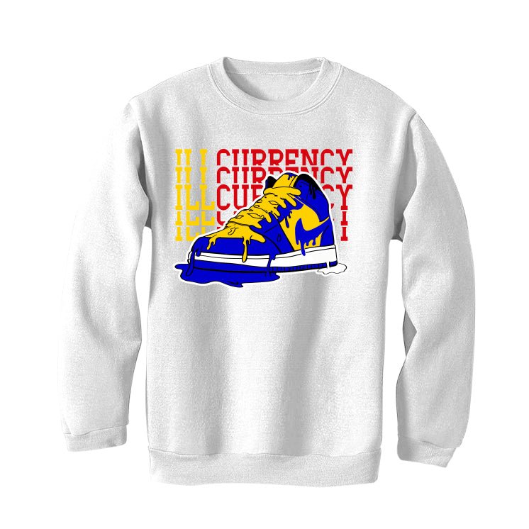 T-shirts, hoodies, and sweatshirts that feature artwork of dripping Air Jordan 1 High OG WMNS in “Reverse Laney,” as well as the word "ILLCURRENCY" in the background, are all available.