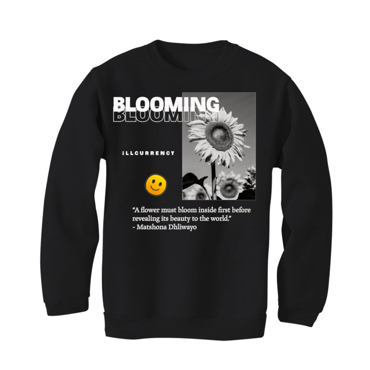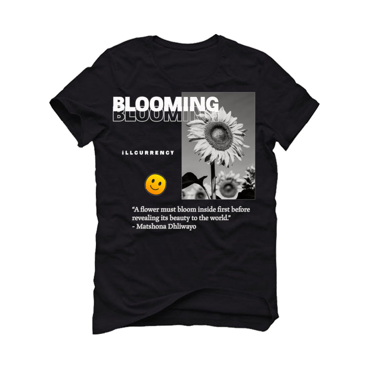 Our sweatshirts, t-shirts, and hoodies with the statement "BLOOMING" with quotation and sunflower and smiley face graphics printed on fabric.