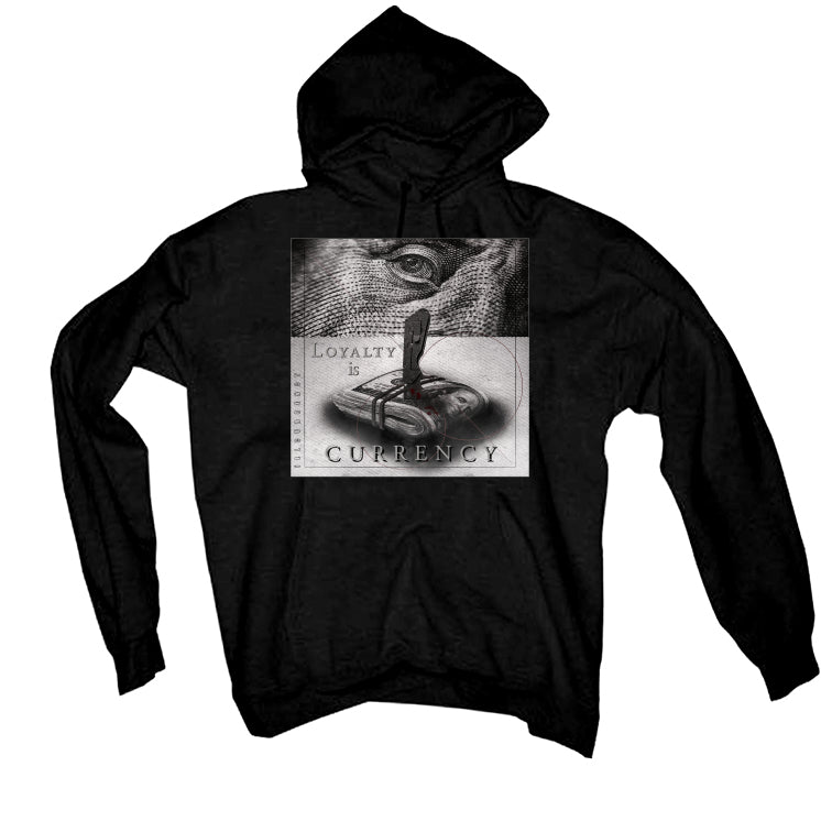 The statement "LOYALTY IS CURRENCY" with a man's image showing only the eye and a pile of cash with a knife on it printed in fabric designs on our sweatshirts, t-shirts, and hoodies.