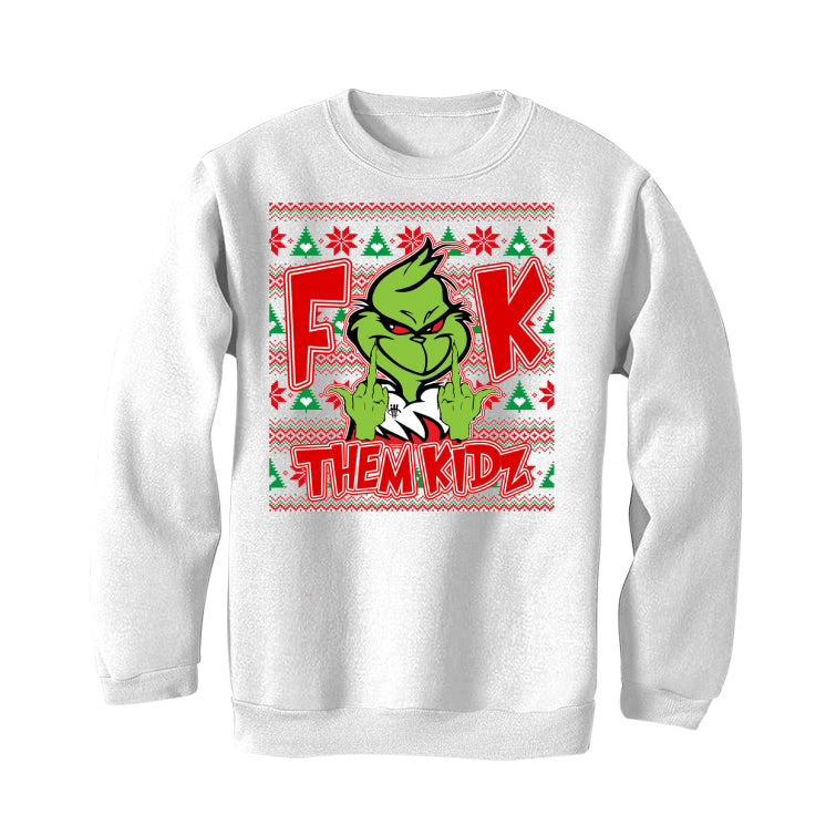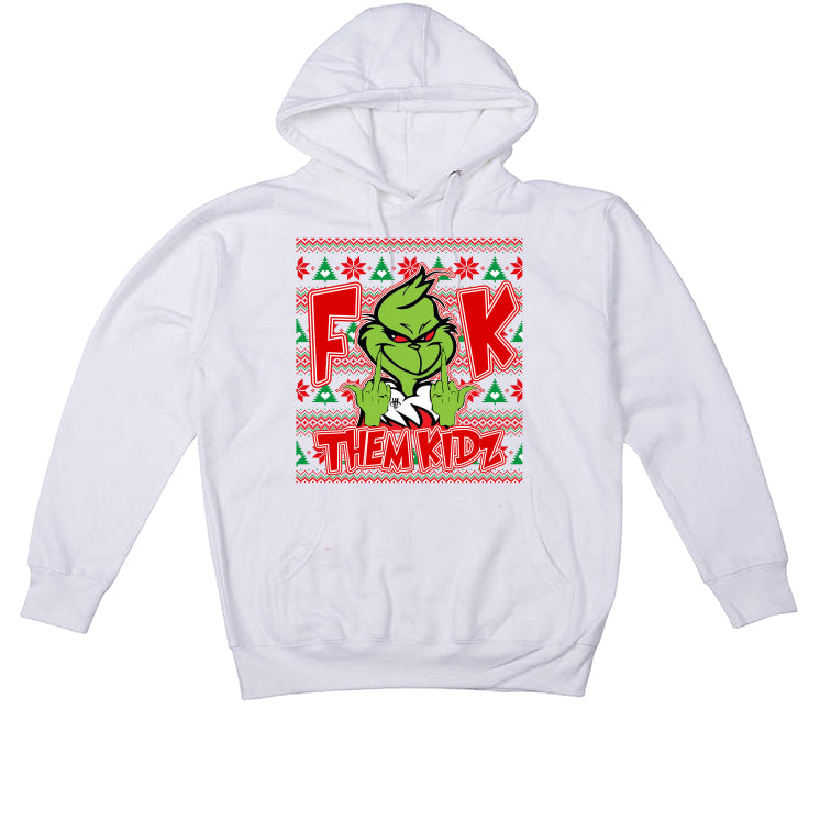 These tees, hoodies, and sweatshirts say "FK THEM KIDZ" with the Grinch giving the middle finger in a Santa outfit, against a Christmas-themed background.
