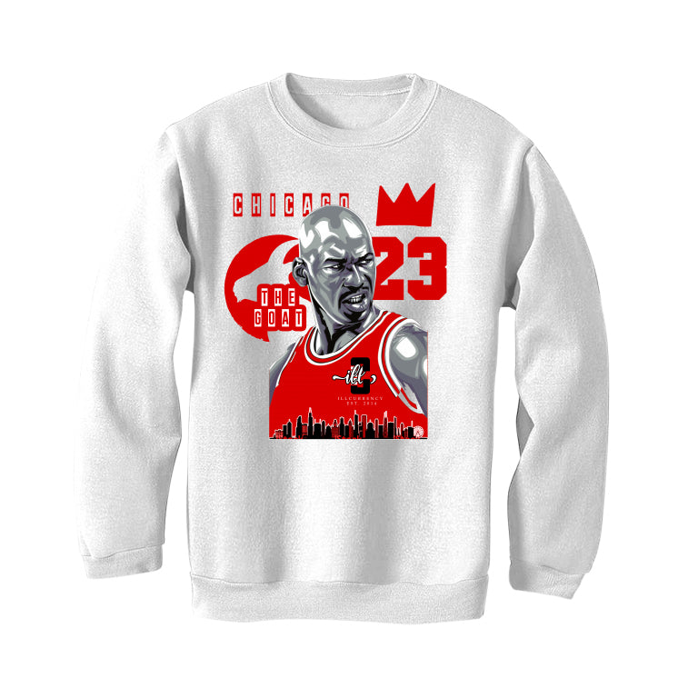 Our selection of hoodies, sweatshirts, and t-shirts has stylish artwork with the words "CHICAGO / THE GOAT / 23" with Michael Jordan's caricature printed on fabric.