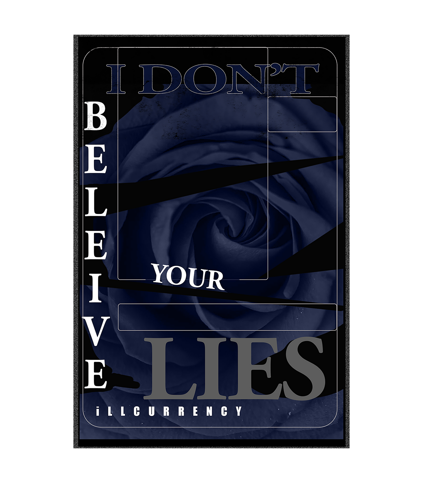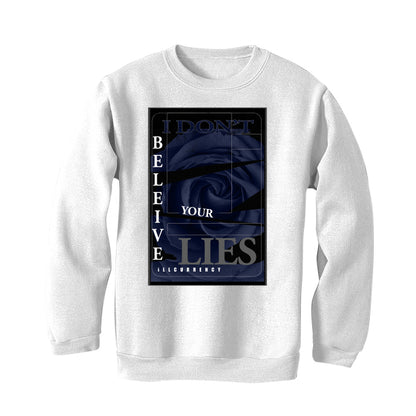 These sweatshirts, t-shirts, and hoodies feature the statement "I DON'T BELIEVE YOUR LIES / iLLCURRENCY" with geometric lines against a rose background, inside a rectangular border, making a bold statement and serving as a valuable addition to any sneaker collection.