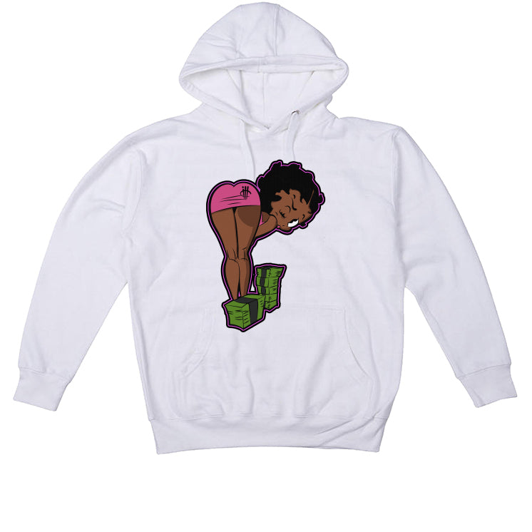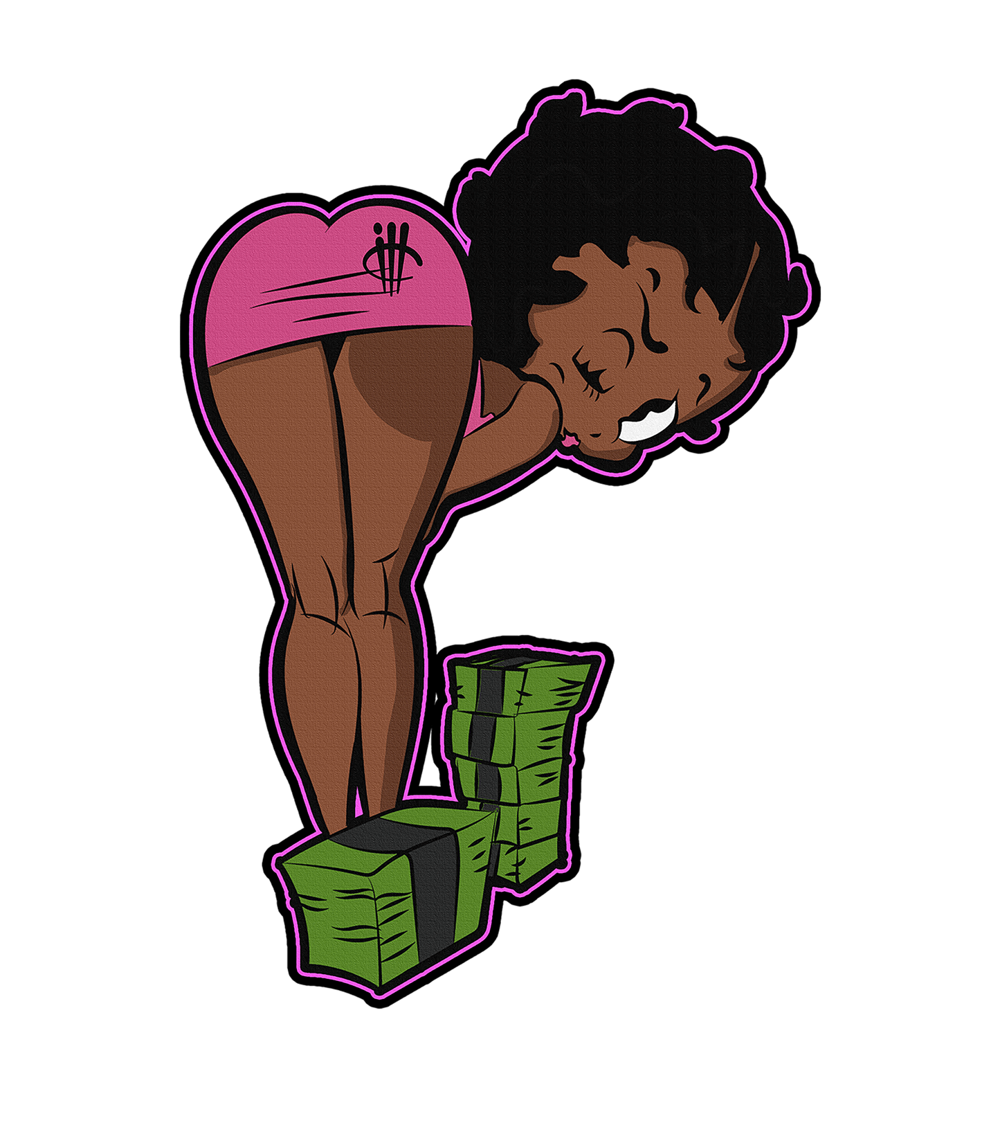 The design features a cartoonized female bending over to reach the cash. The material used is 100% cotton and that means you don't have to worry about the apparel being too hot on the skin.