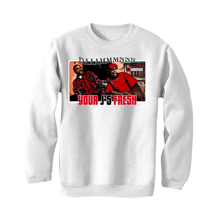 Turn heads with your Air Jordan 12 Cherries in this perfect white shirt. This premium fabric elevates your Jordan 12 outfit, not just in comfort, but with a bold statement. We've captured the shoe's iconic "Cherry" hue for a flawless match. Let illCurrency's exclusive "Daaaaamnnn Your J's Fresh" graphic do the talking. This Jordan 12 shirt isn't for everyone, it's for those who own their fire style. Complete your legendary look with confidence.