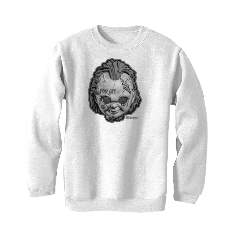 The phrase "illCurrency" beneath a Chucky head with stitches, and tattoos of an ice cream cone, paw print, and the words "DRIP" and "TRAP LIFE" printed on our t-shirts, sweatshirts, and hoodies.