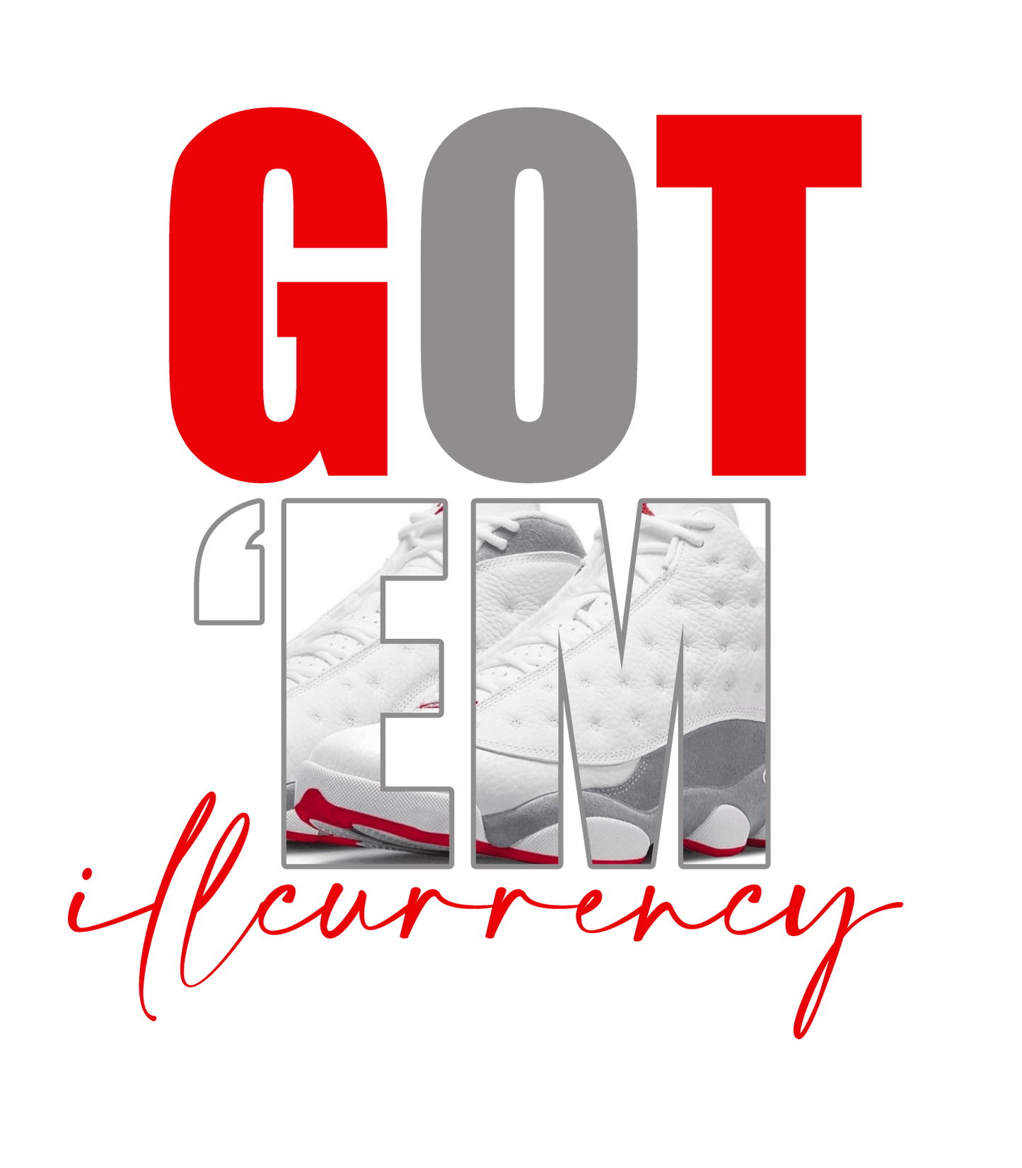 Flex your sneaker game and own the streets with our bold "Got 'Em" shirt. Featuring a striking silhouette of the Air Jordan 13 Wolf Grey, this piece is a must-have for any sneakerhead. The shirt's confident message, paired with the iconic shoe design, creates a powerful statement. The Wolf Grey colorway adds a touch of sophistication, making this shirt a versatile addition to your wardrobe. Whether you're rocking your Jordan 13s or dressing down, this shirt is the perfect way to showcase your love for sneakers. Experience the perfect blend of style and attitude with illCurrency.