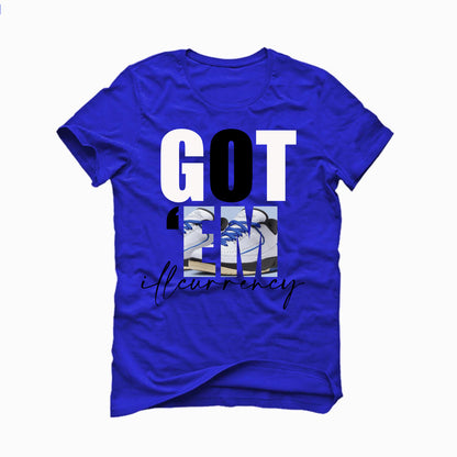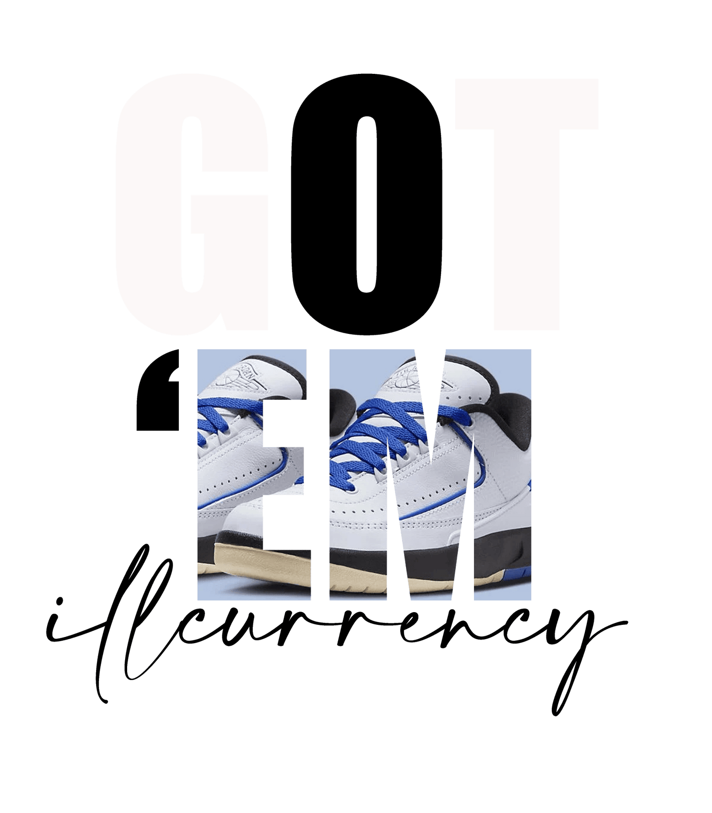 This fantastic product is available as a hoodie, t-shirt, or sweatshirt—all showcasing the playful phrase "Got 'Em / illCurrency," beautifully displayed alongside a silhouette of AJ2 Low Varsity Royal. Embrace this opportunity to enhance your wardrobe and express yourself effortlessly!