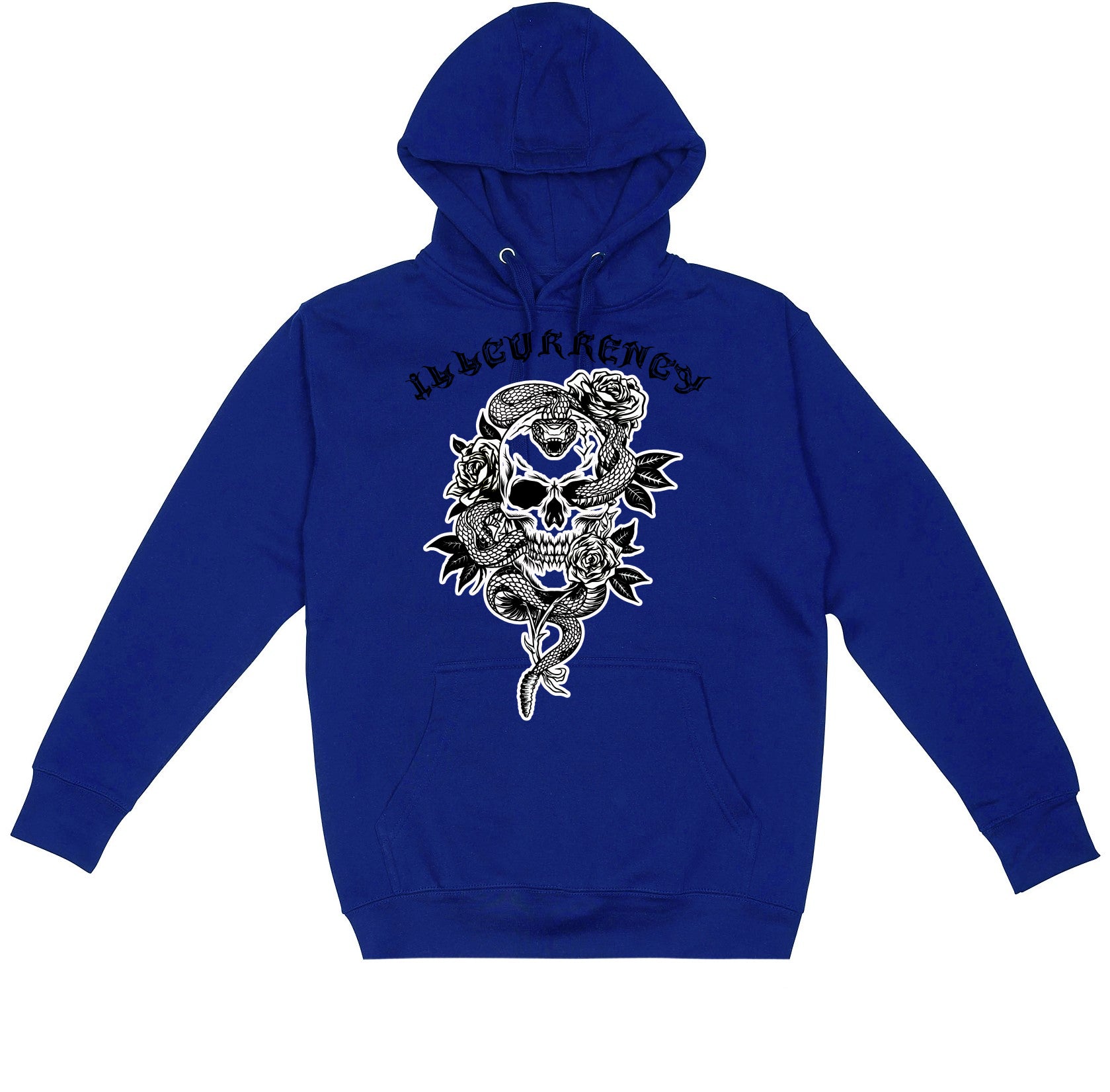 Available in sweatshirt, hoodie, and t-shirt styles, each item showcases the phrase "illCurrency" in elegantly crafted fonts alongside a distinctive caricature of a snake skull rose.