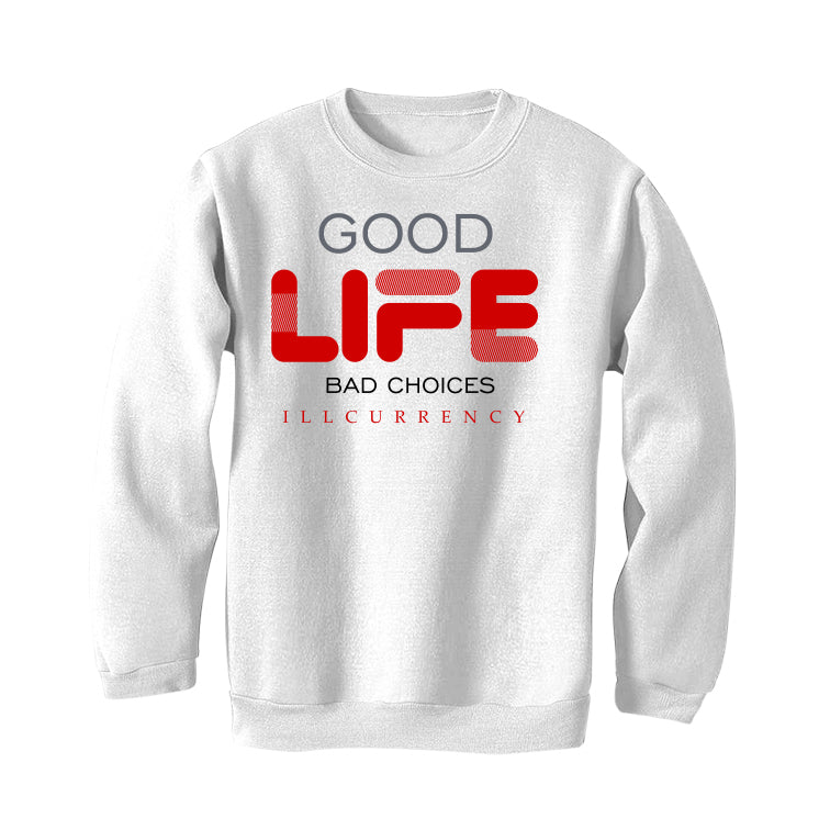 Our sweatshirts, hoodies, and t-shirts include the statement “GOOD LIFE / BAD CHOICES / ILLCURRENCY" printed on fabric.