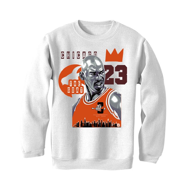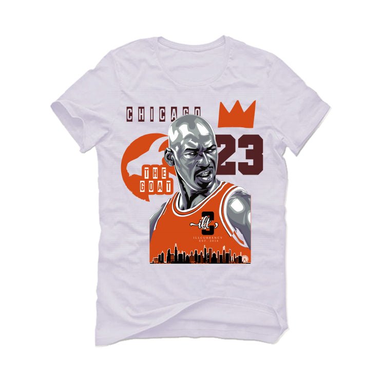 Looking for some fresh apparel to match your Air Jordan 3 GS shoes in the "Mars Stone" colorway? Check out our tops designed in the US, perfect for fans of His Airness. With vintage tumbled leather in a clean white shade, this '88-inspired silhouette also features a pop of orange on the sock liner, eye stays, and quarter overlay. The black Jumpman on the tongue and tread add a touch of contrast, while "Sail" accents on the back tab, midsole, and mudguard bring balance. The perforated collar, elephant print overlays, and midsole section all sport the main color, with a dark grey tongue to top it off. Our Chicago-inspired Jordan 3 Mars Stone outfit collection (hoodie, t-shirt, and sweatshirt) all boast a playful "CHICAGO / THE GOAT / 23 / ILLCURRENCY" design with a goat and crown motif, along with a nod to Michael Jordan. Get yours now!