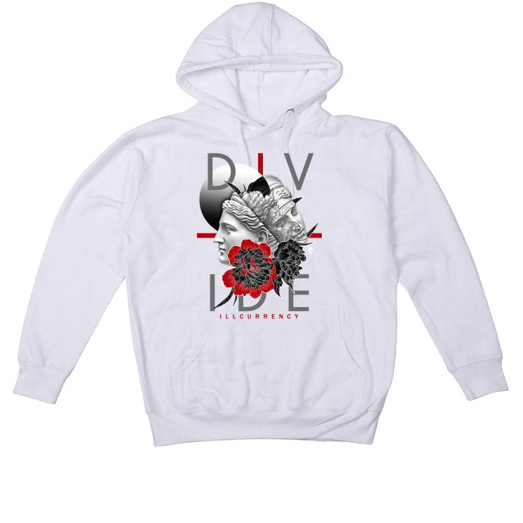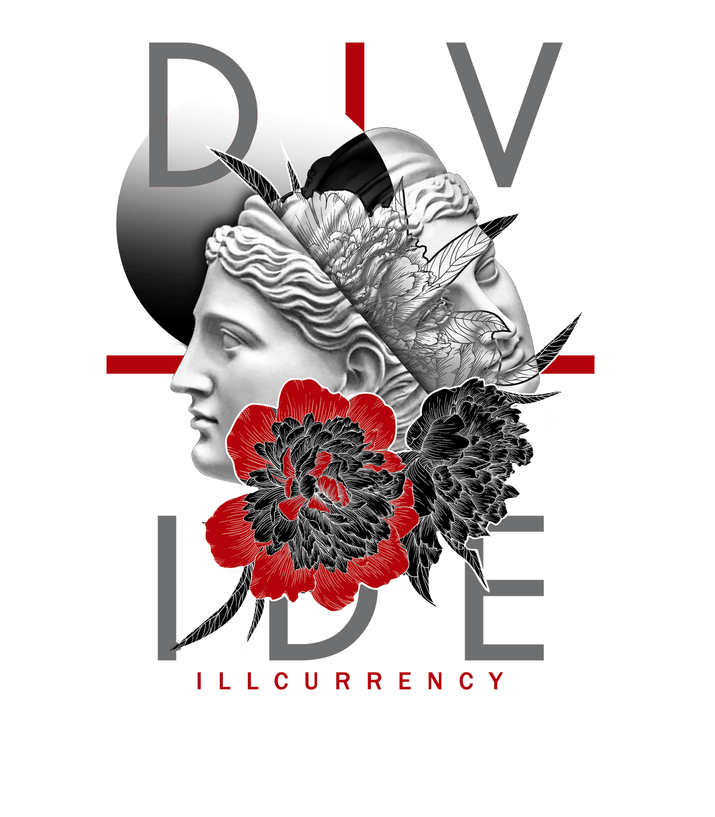 Our collection features a cozy hoodie, stylish t-shirt, and trendy sweatshirt adorned with the captivating phrase "DIVIDE / ILLCURRENCY," accompanied by artistic designs of circles, lines, two statue faces, whimsical flower illustrations, and a subtle illCurrency logo. Embrace your unique style today!