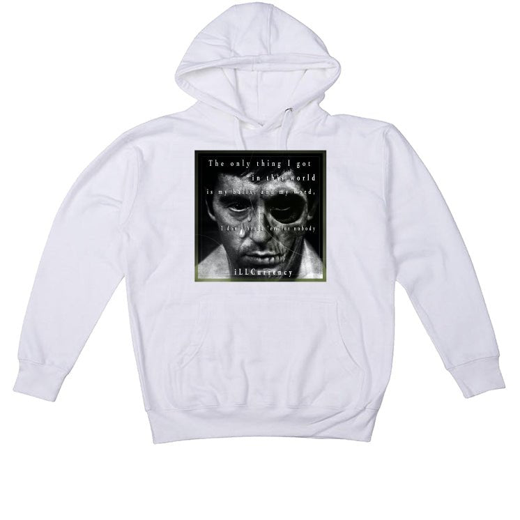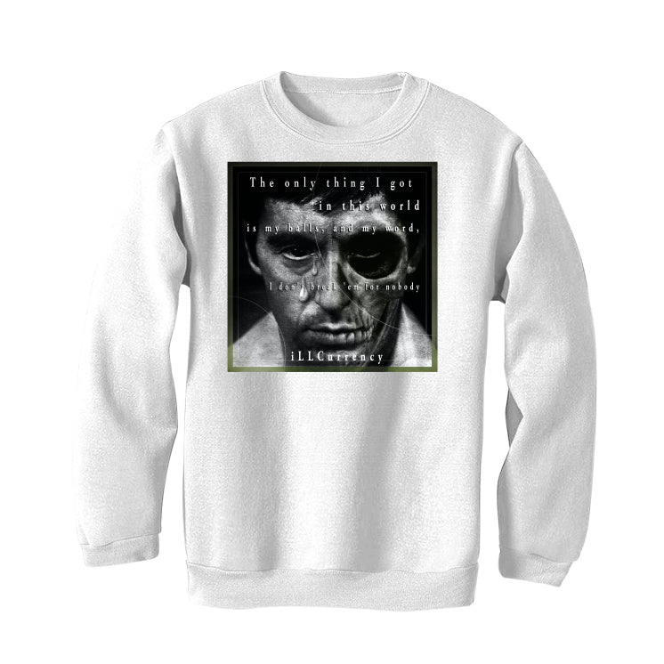 This collection includes a hoodie, t-shirt, and sweatshirt adorned with the phrase: "The only thing I got in this world is my balls, and my word; I don't break 'em for nobody / iLLCurrency." It showcases an edited image of Tony Montana crying next to half a skeleton's face within a square frame.