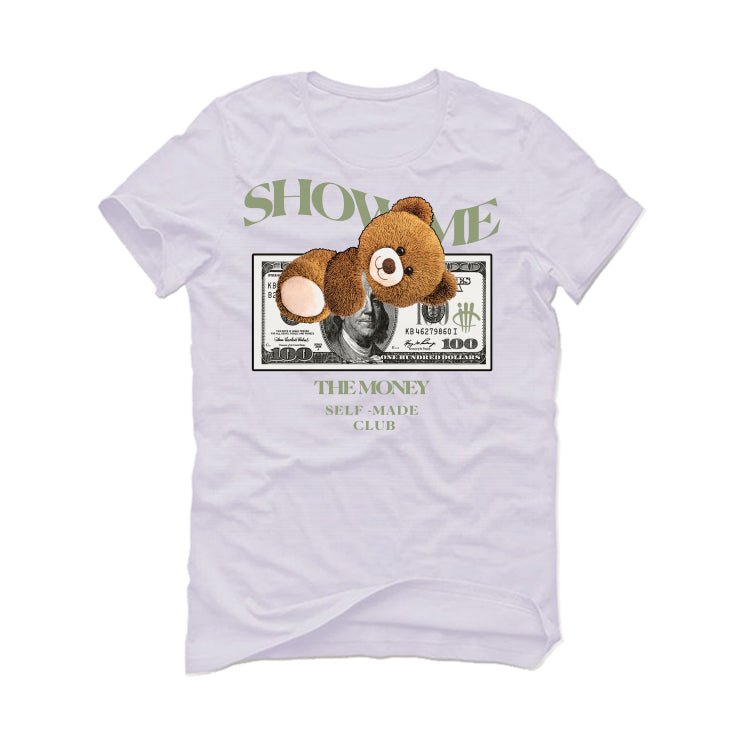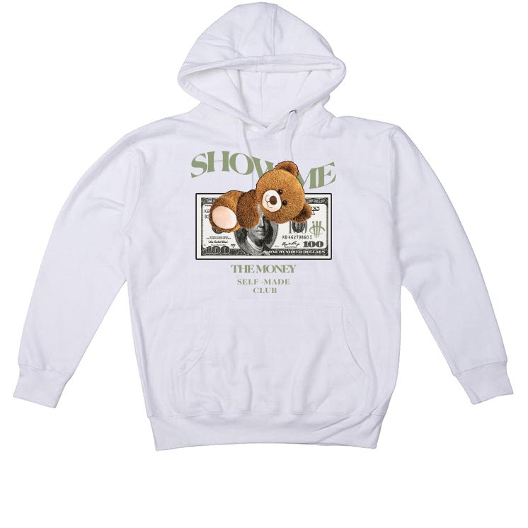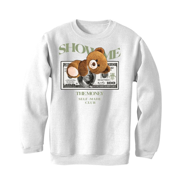 This collection includes a hoodie, t-shirt, and sweatshirt adorned with the phrase “SHOW ME / THE MONEY / SELF-MADE CLUB,” featuring a teddy bear atop a $100 bill. These statement pieces are the perfect way to complete your Air Jordan 4 Seafoam look.