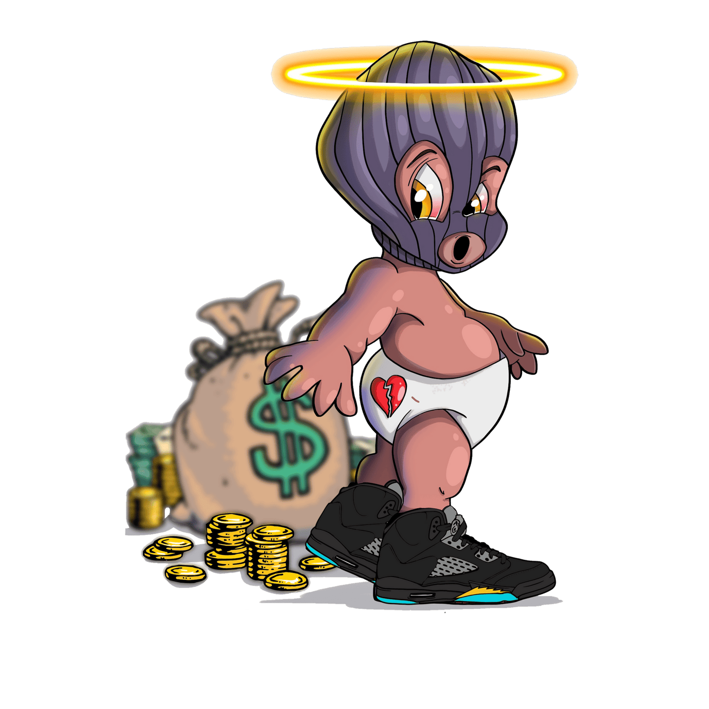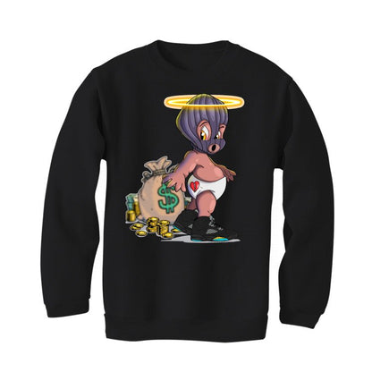 Upgrade your wardrobe with our unique, soft cotton graphic tees tailored to showcase the iconic Air Jordan 5 Aqua kicks. The unconventional color scheme is reminiscent of the exclusive Chris Paul PE made for the New Orleans Hornets. With a black nubuck top and translucent quarter-panel netting, these historical shoes offer breathability and style. A bright teal Jumpman logo adorns the tongue and back heel of the silver, glowing sneaker. A black polyurethane midsole with yellow shark-tooth patterns and a clear Air-sole cushion in the heel provide support and comfort. The outsole is made of translucent rubber with a vibrant turquoise painted finish for long-lasting traction. Our product line includes a hoodie, t-shirt, and sweatshirt featuring a quirky illustration of a baby with a halo, ski mask, diaper with a broken heart, "Aqua" Air Jordan 5s, and a bag with a dollar sign, cash stacks, and coins on the ground.