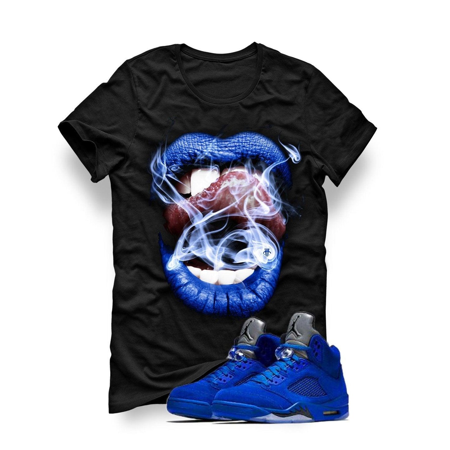 Air Jordan 5 Blue Suede Black T (Smoke N Lips) is a premium quality sneakerhead t shirt. It matches with the Air Jordan 5 Blue Suede Sneakers.