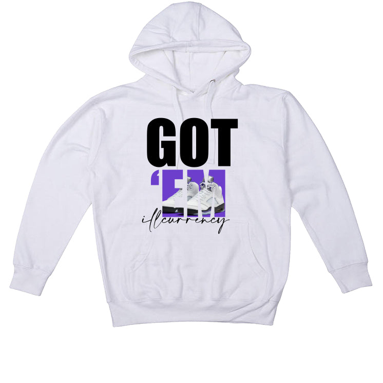 "GOT 'EM / illcurrency" with Air Jordan 5 "Concord” image printed on fabric.