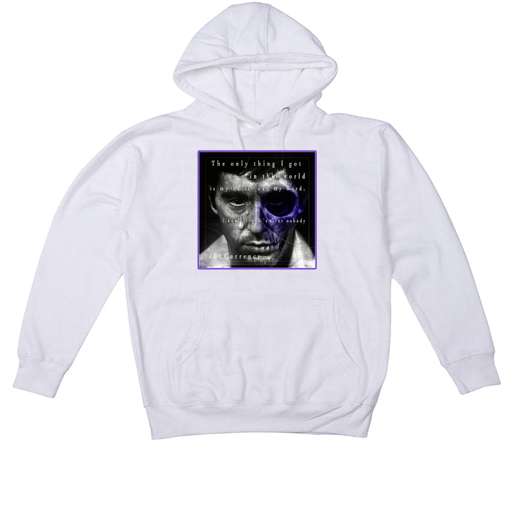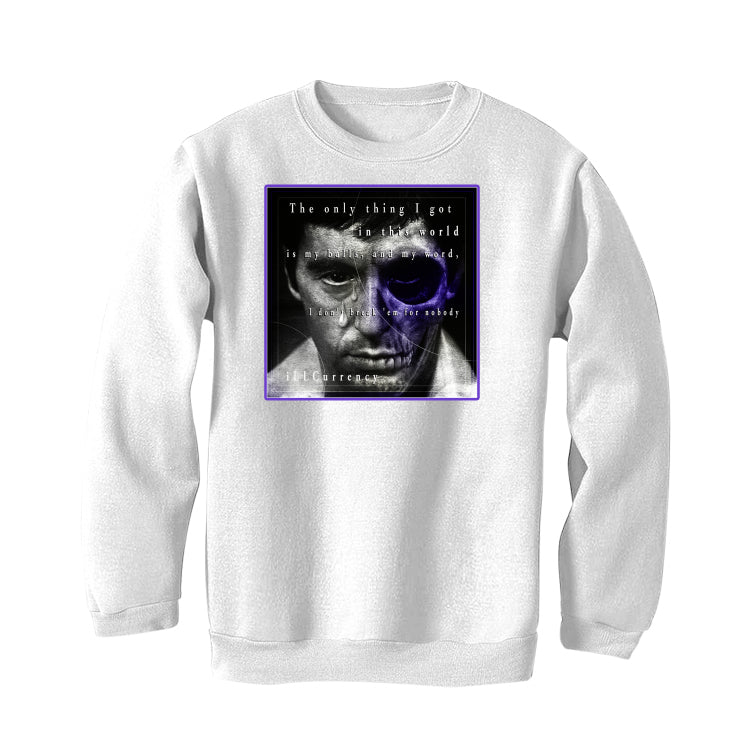 This product comes in a hoodie, t-shirt, and sweatshirt that features the phrase "The only thing I got in this world is my balls, and my word, I don't break 'em for nobody / iLLCurrency" against an edit of Tony Montana with tears and half the face of a skeleton, inside a square border printed on fabric.