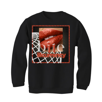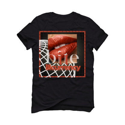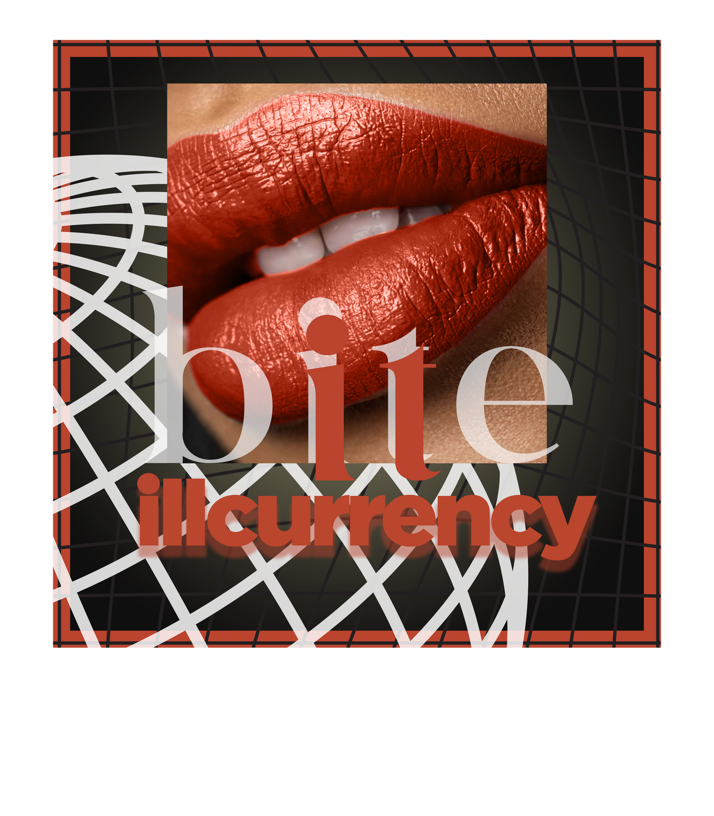 These tees, hoodies, and sweatshirts are printed with the "bite / illcurrency" with lipstick against a background of curving lines, inside a square border.