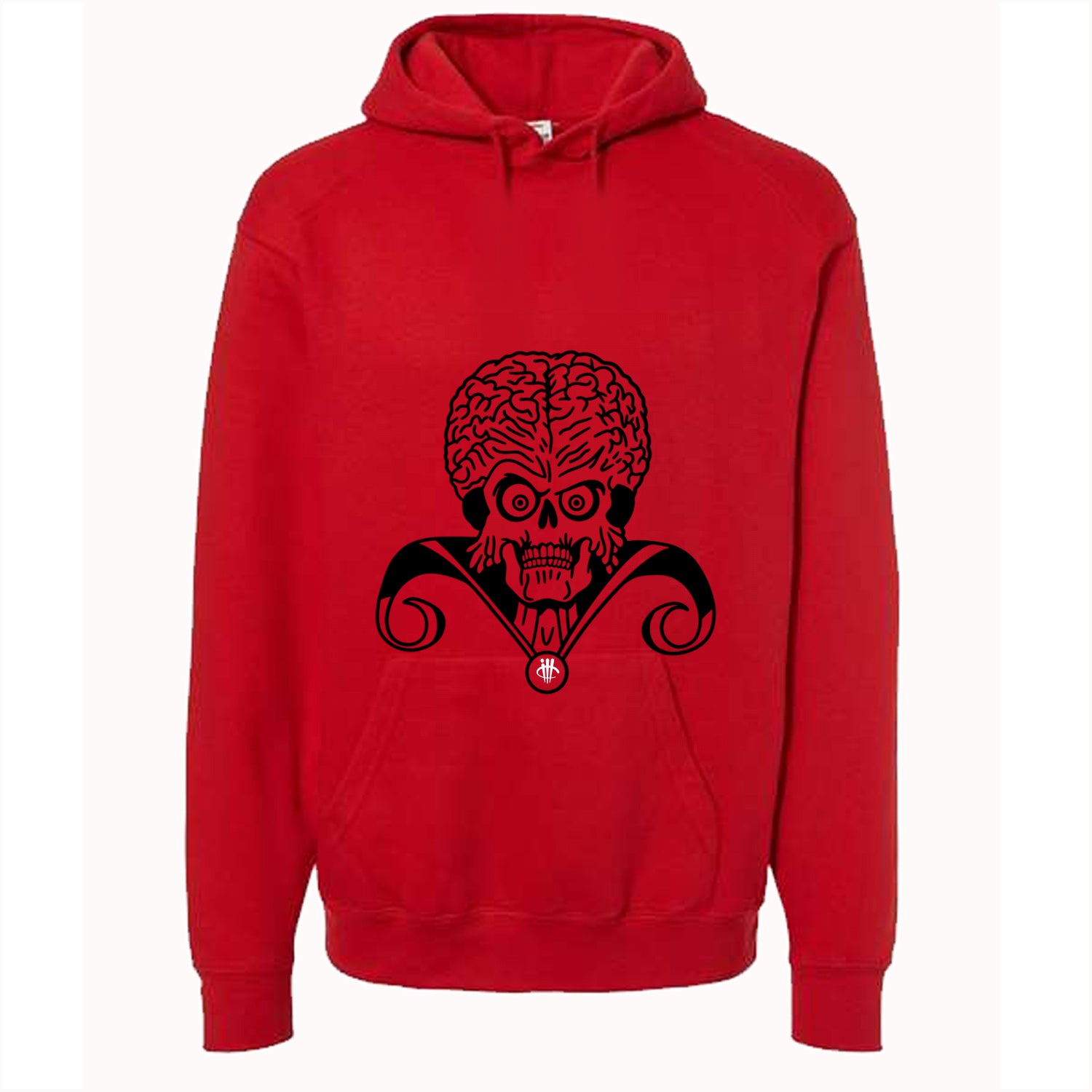 Our sweatshirts, tees, and hoodies are printed with a drawing of a Martian character's head, plus a collar and pendant.