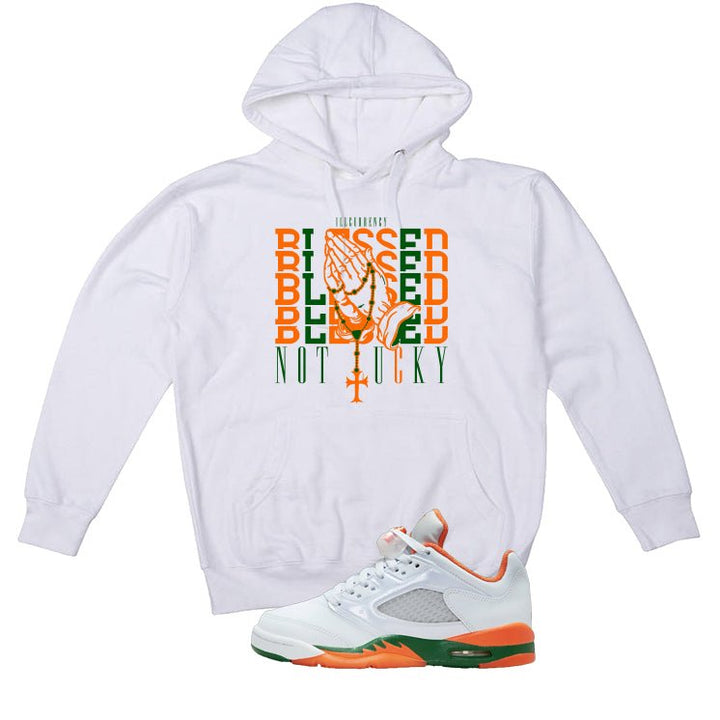 Air Jordan 5 GS Miami Hurricanes White T-Shirt (Blessed not lucky)| illcurrency