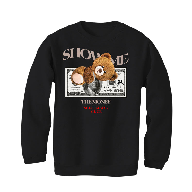 Upgrade your shoe game with this black cotton clothing, perfect for pairing with the Air Jordan 5 Low "PSG." The Jordan 5 Retro Low PSG features a grey suede upper, matching laces and translucent mesh panel, red lace toggles, and a tricolor "paname" tag. The tongue comes in a different shade of grey with a blue Jumpman, and the heel features a red wax Paris Saint-Germain seal design. The black and grey polyurethane midsole has a spiky motif, while the icy blue rubber outsole features co-branding. Our hoodies, sweatshirts, and shirts say "SHOW ME / THE MONEY / SELF-MADE CLUB" with a teddy bear on top of a $100 bill.