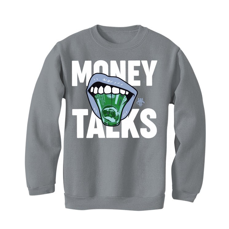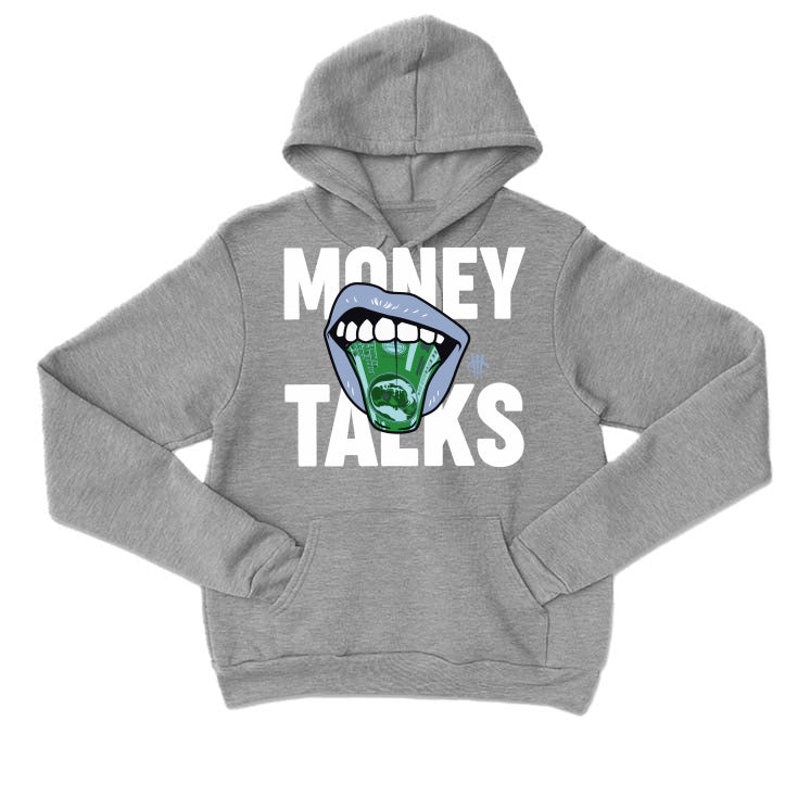 Upgrade your wardrobe with our grey cotton clothing, perfect for pairing with the Air Jordan 6 "Cool Grey". This Jordan 6 Cool Grey features a white leather upper, grey tongue tag, and nubuck underlays. The tongue, lace locks, and heel tab are all a different shade of grey. The midsole is a mix of white and grey, and the outsole is a translucent icy blue. With Jumpman branding on the tongue and heel, these hoodies, tees, and sweatshirts feature a cartoon mouth with a hundred-dollar bill tongue that reads "MONEY TALKS".