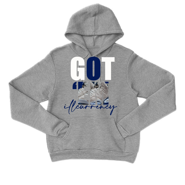Our t-shirts, hoodies, and sweatshirts are printed with an image of the Air Jordan 6 "Georgetown" and the words "got 'em."