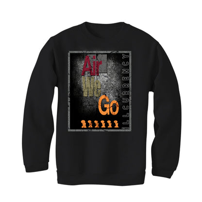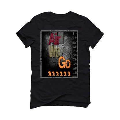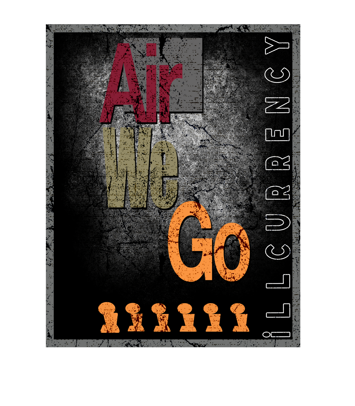 Our hoodies, sweatshirts, and tees say "Air We Go / ILLCURRENCY" with geometric shapes against a cloudy-looking, textured background in a rectangular border.