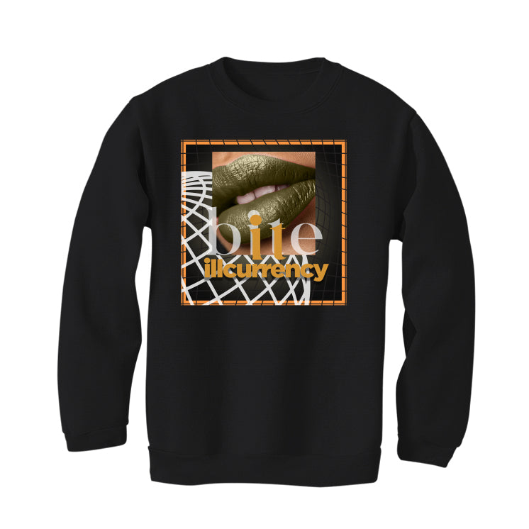 These hoodies, tees, and sweatshirts say "bite / illcurrency" with the letters "it" duplicated and a photo of a mouth with lipstick against a background of curving lines, inside a square border.