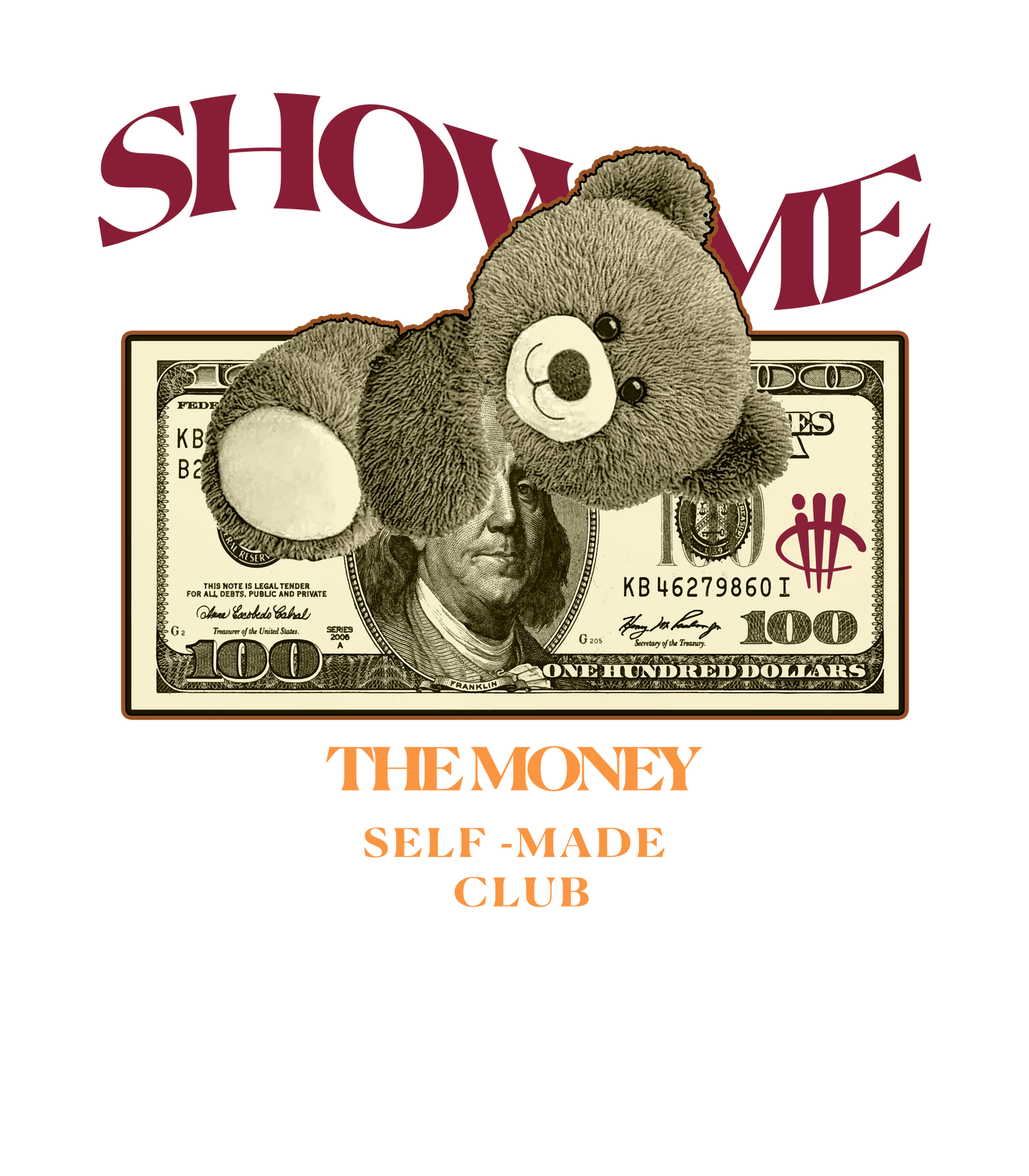 These hoodies, tees, and sweatshirts say "SHOW ME / THE MONEY / SELF-MADE CLUB" with a teddy bear on top of a $100 bill.