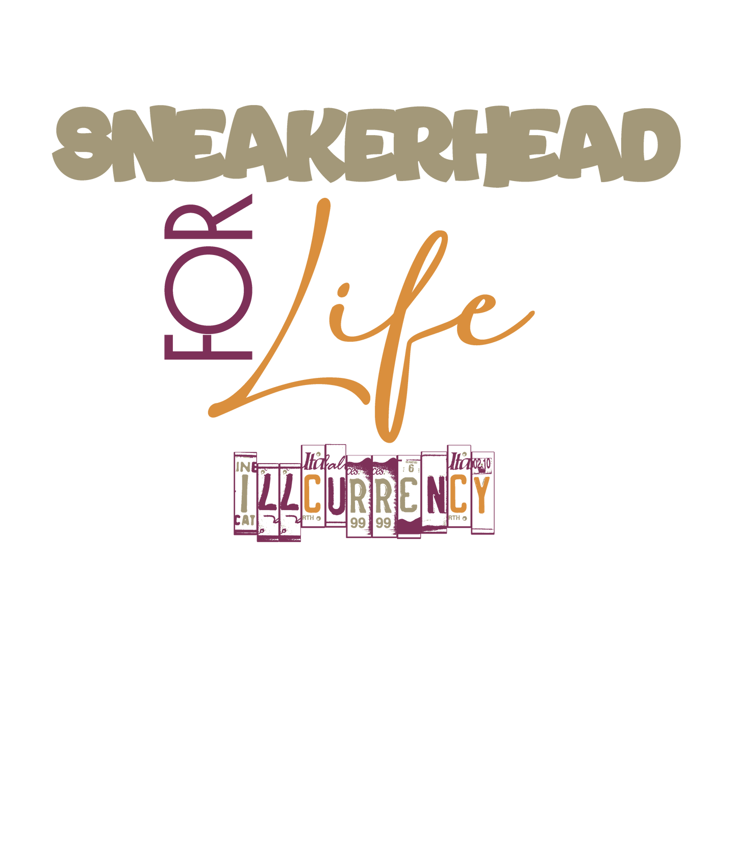 Our t-shirts, sweatshirts, and hoodies are printed with the words "SNEAKERHEAD FOR Life / ILLCURRENCY" in various typefaces with the last word enclosed in rectangles.