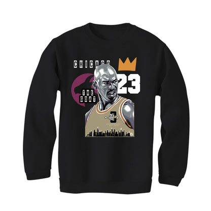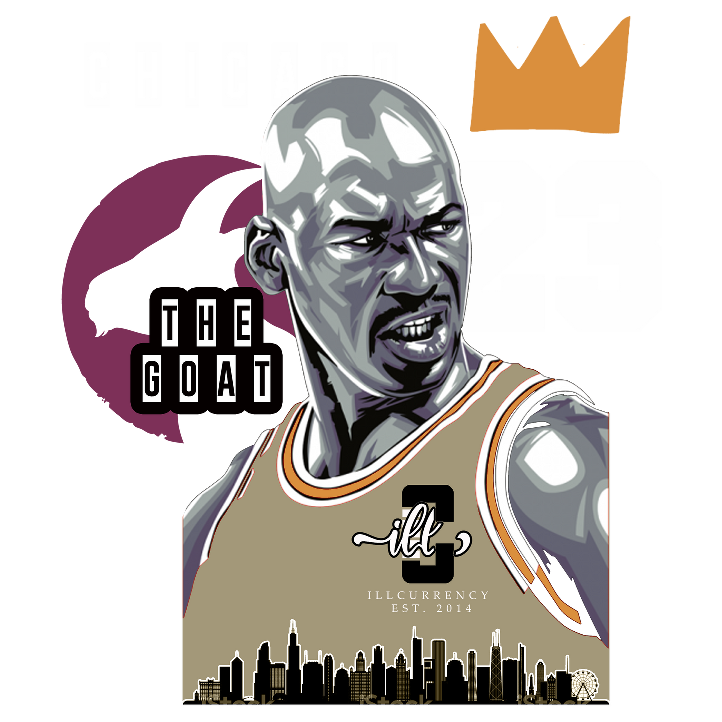 The phrase "CHICAGO / THE GOAT / 23 / ILLCURRENCY" with the silhouette of a goat and crown, and an illustration of Michael Jordan printed on our t-shirts, sweatshirts, and hoodies.