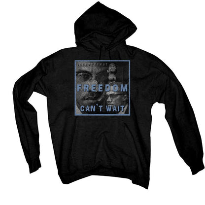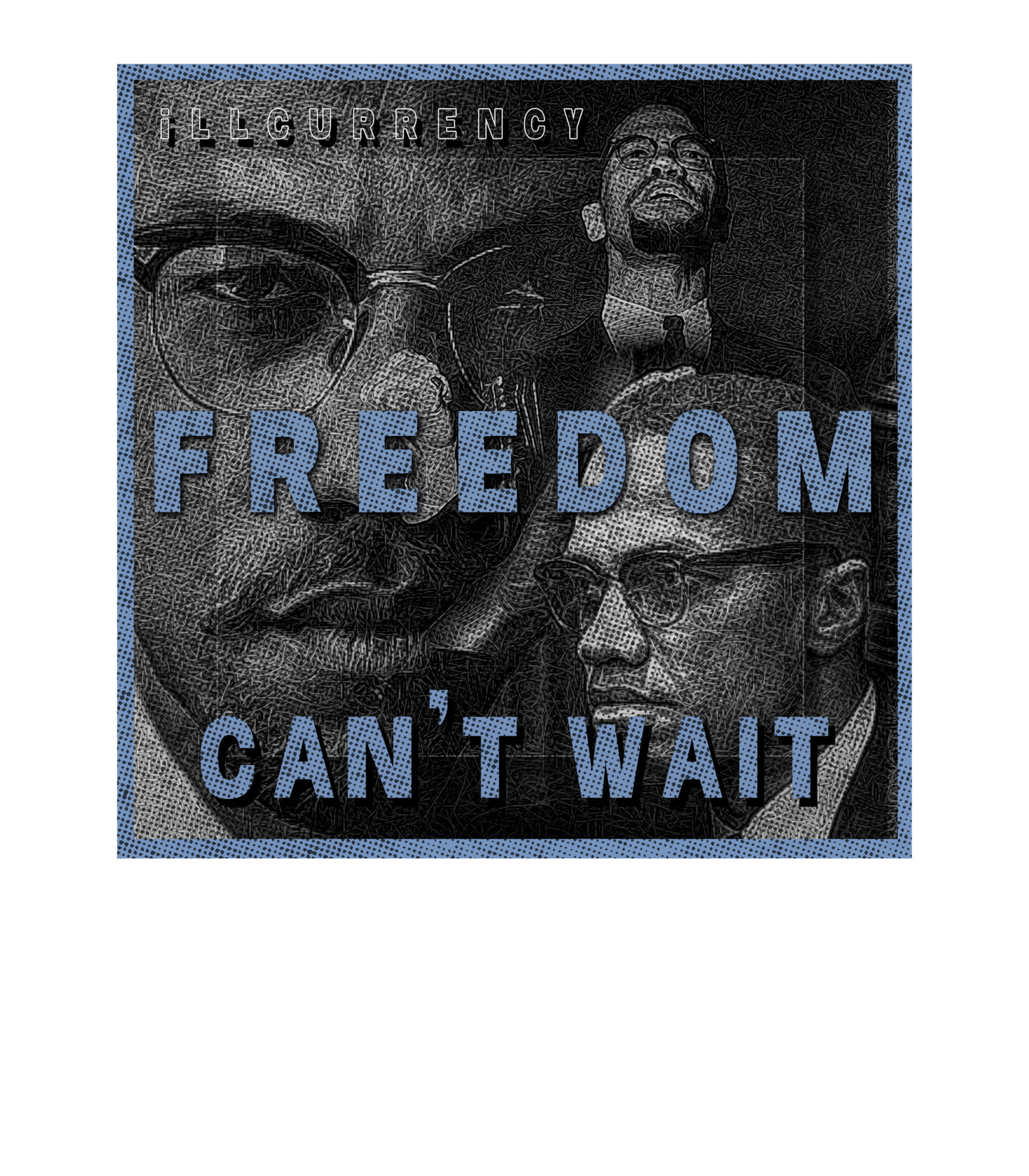Our t-shirts, sweatshirts, and hoodies are printed with "ILLCURRENCY / FREEDOM / CAN'T WAIT" with three images of Malcolm X inside a square border.