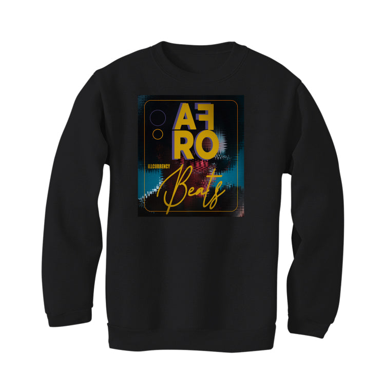 Our sweatshirts, t-shirts, and hoodies say "AFRO BEATS / iLLCURRENCY" with a graphic of a person that has an afro.