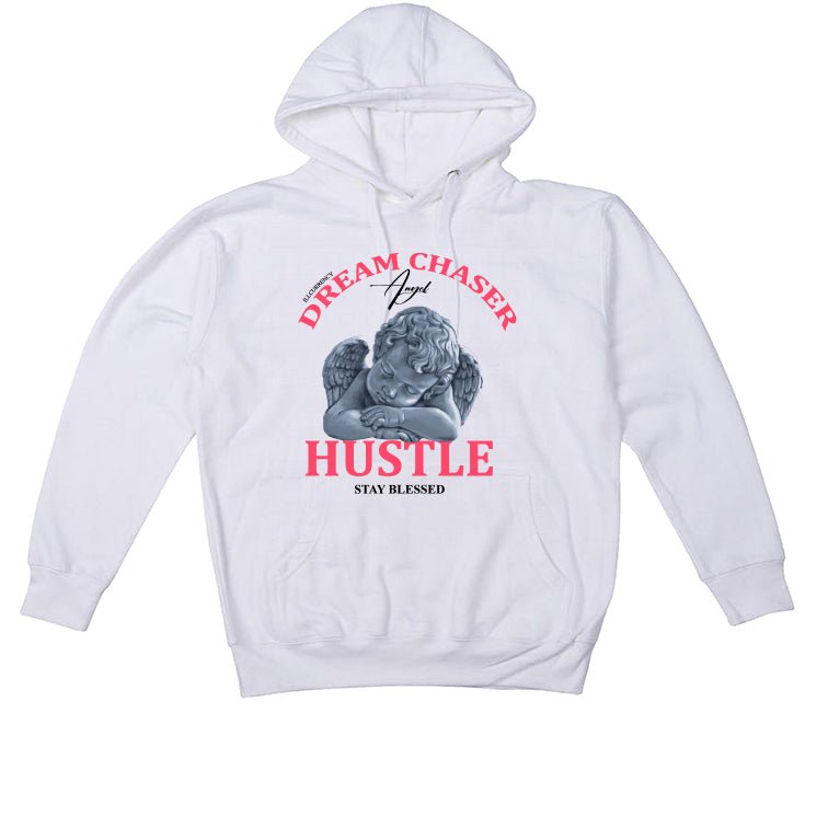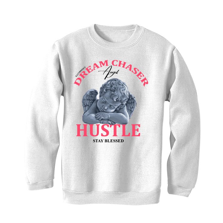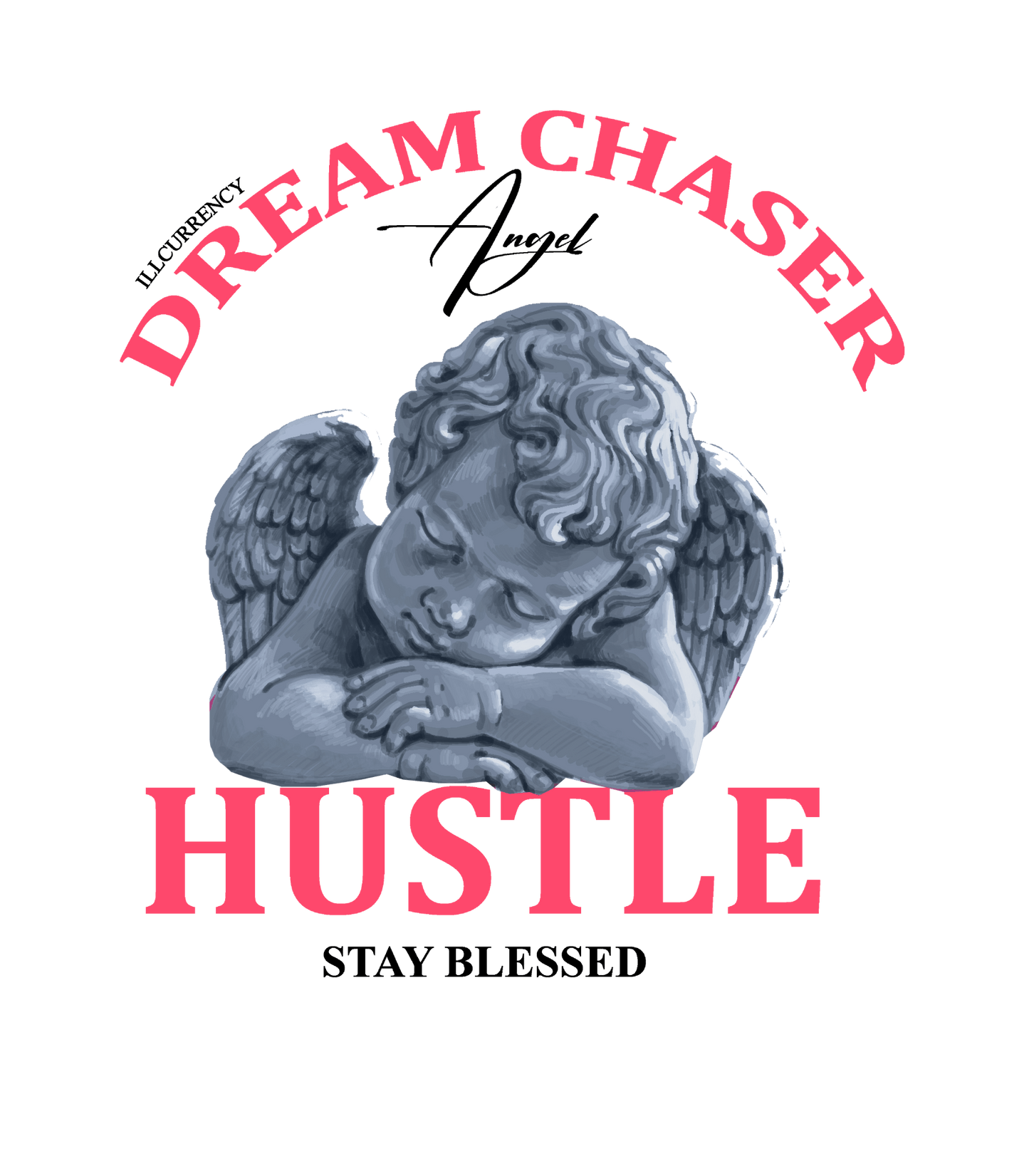 Our collection includes sweatshirts, hoodies, and t-shirts adorned with inspirational phrases such as "Dream Chaser / Angel / Hustle / Stay Blessed," presented in decorative fonts along with an artistic sleeping angel illustration.