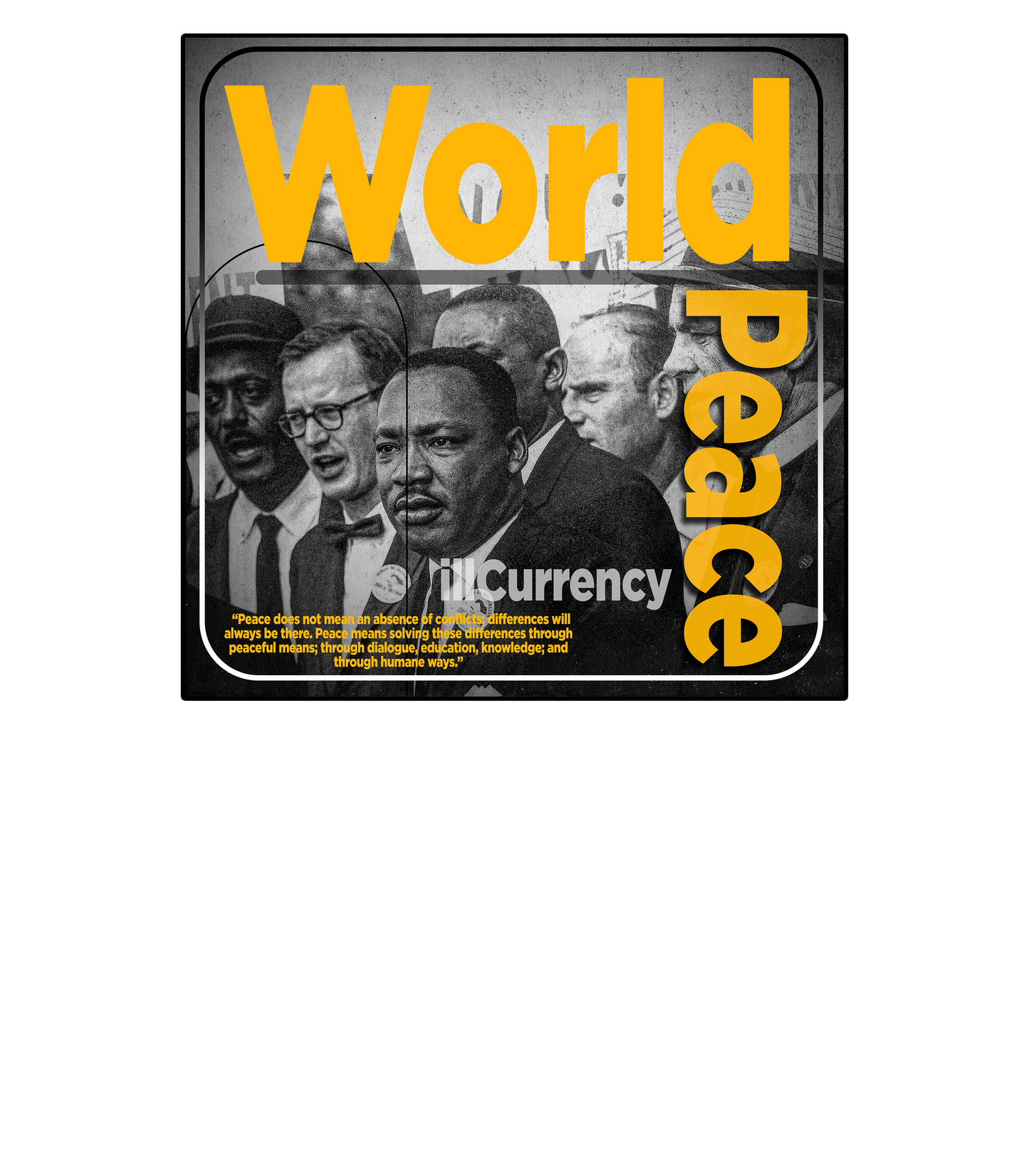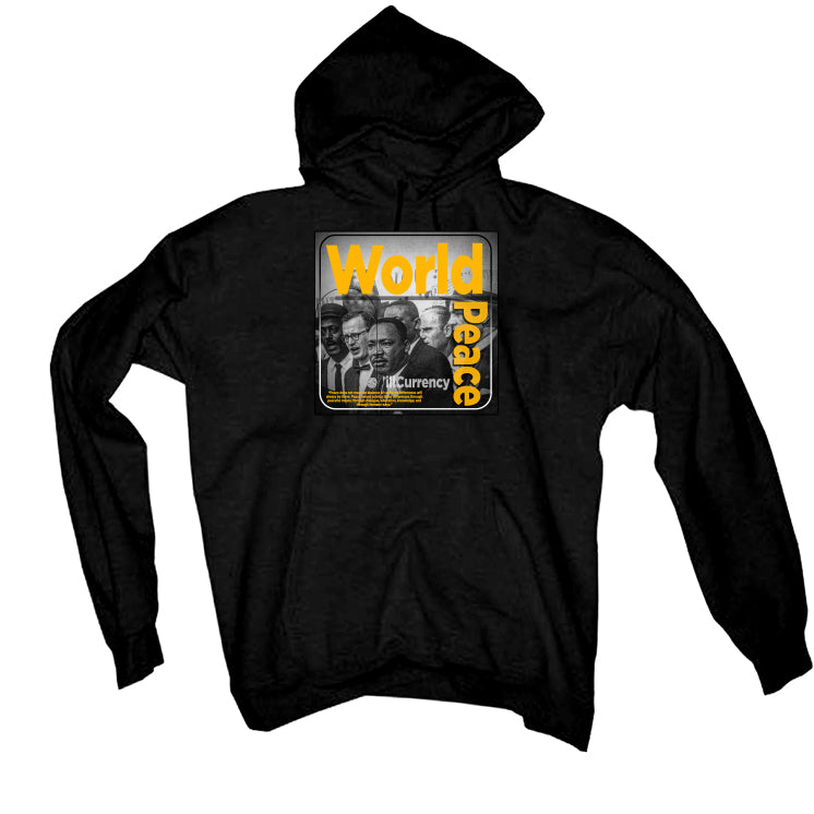 Transform your Jordan 8 Taxis in the "Taxi" colorway with our bold statement tops. Made from the softest cotton, our tops perfectly complement the official colorway of the shoe in Black, Taxi, and Opti Yellow. The all-black leather design with yellow details on the ankle straps, tongue labels, and rubber midsoles create a unique and eye-catching look. Complete the black and yellow motif with a dark outsole, creating a whole new impression. Our t-shirts, sweatshirts, and hoodies feature a powerful statement, "World / Peace / illCurrency /" against a photo of MLK, surrounded by geometric lines in a square border. Let the power of peace inspire your style.