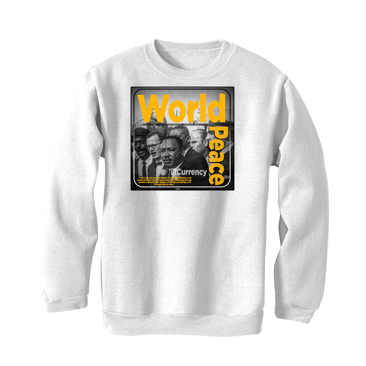 For sneaker enthusiasts sporting the iconic Air Jordan 8 "Taxi" colorway, this unique and bold statement top is the perfect accessory. The official colorway features a striking combination of Black, Taxi, and Opti Yellow. The base layer and overlay system are a sleek black leather, with accents of yellow on the ankle straps, tongue labels, and midsoles. A dark outsole completes the dynamic black and yellow design. These Jordan 8 outfits (t-shirts, hoodies, and sweatshirts) are adorned with a powerful message, "World / Peace / illCurrency / ", along with a photo of MLK and geometric lines, all encased in a square border. Let this statement piece remind you that true peace is achieved through peaceful means, dialogue, education, and understanding.