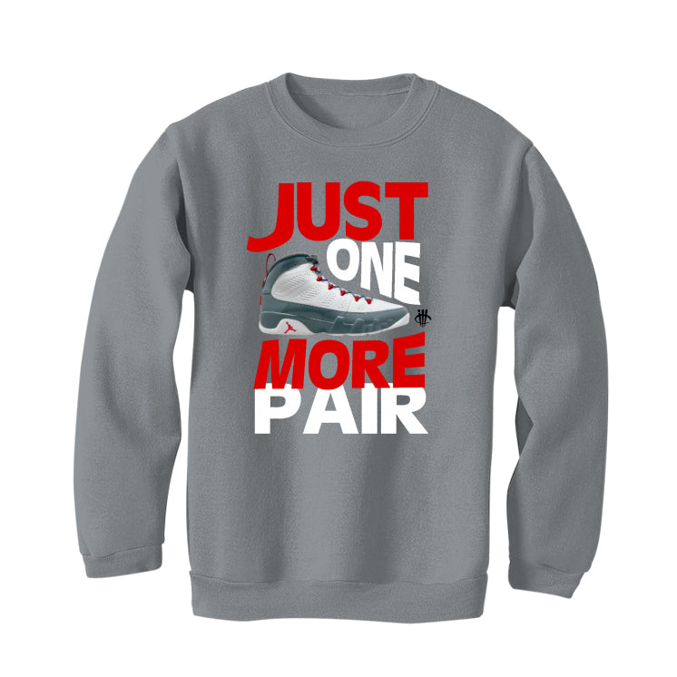 These statement sweatshirts, t-shirts, and hoodies say "JUST ONE MORE PAIR" with Air Jordan 9 "Fire Red" and small illCurrency logo.