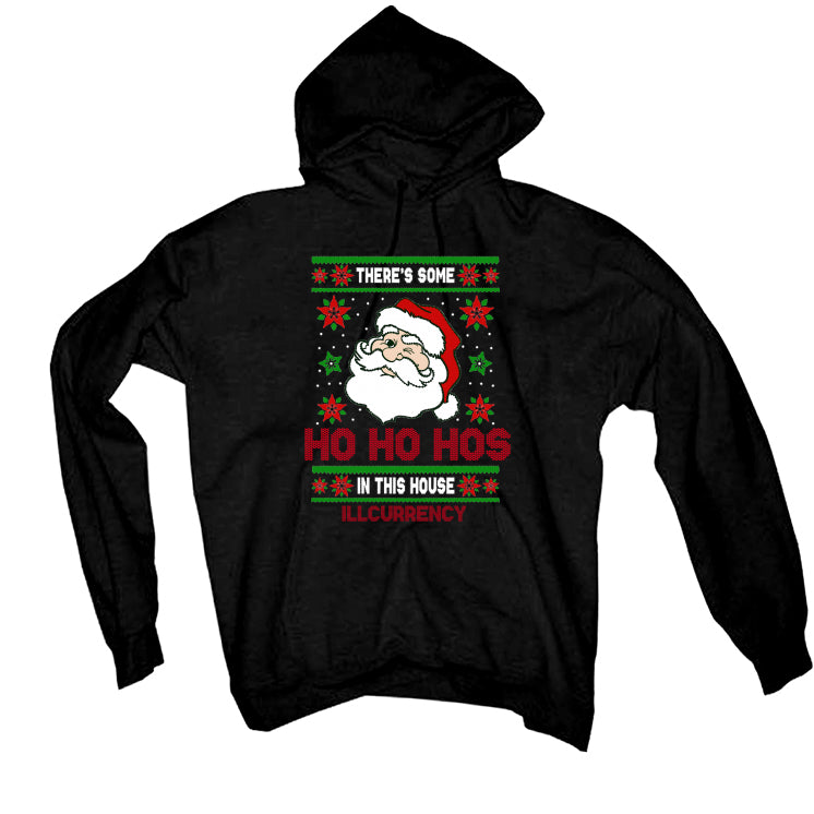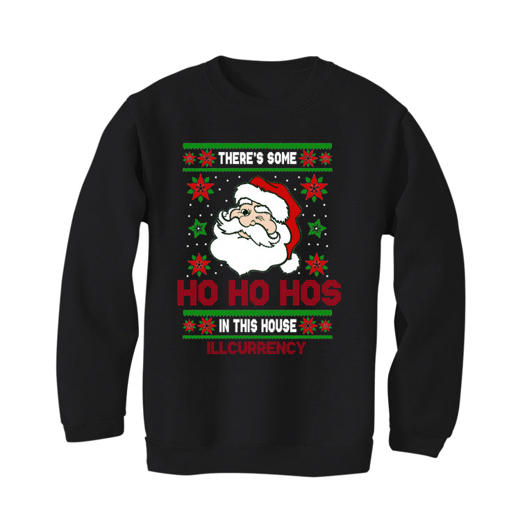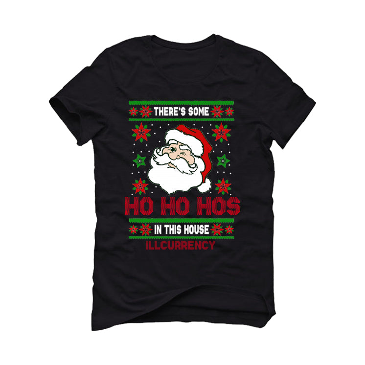 - Print - "THERE'S SOME HO HO HOS IN THIS HOUSE / ILLCURRENCY" with winking Santa head, poinsettias, dots, and scalloped lines
