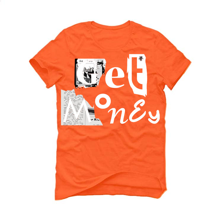 Our tees"Get Money" in different fonts with newspaper fragments and a small illCurrency logo.